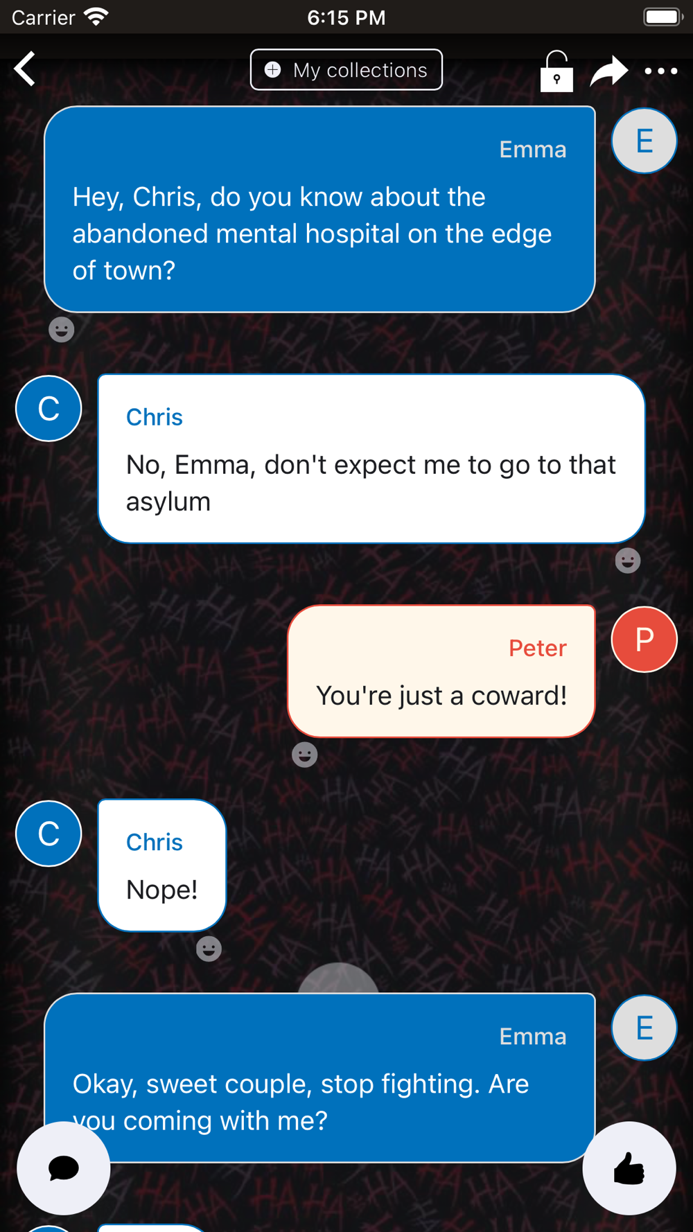 Do you like to read stories? Or maybe you don't like to read books at all, and prefer cool games? In any case, Mistory is what you need! Make choices in episodes of the story, or become the main character of the chat story. Here you will find interactive horror stories, creepy and scary stories, passionate romantic stories about love, fascinating stories about exciting adventures, fan fiction – and all this in the game format of chat stories in English. Many new chat stories of various genres and authors are waiting for you every day in our club of romance and scary stories!