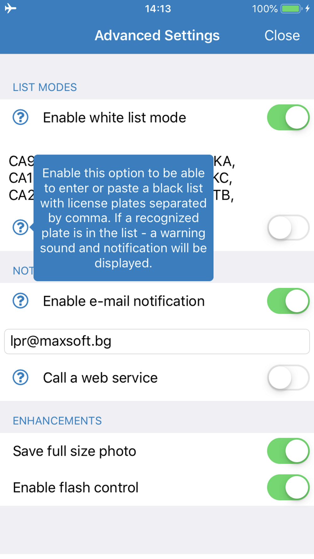 Use white and black list modes for license plates. Get notified by e-mail or integrate our app with your system or business application by enabling web service calls.