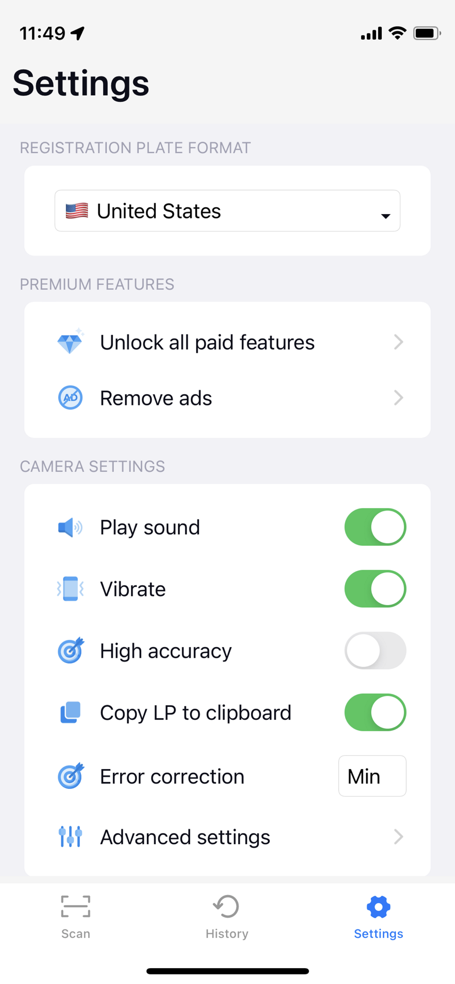 Scan instantly any car license plate with your phone and save it in your history with location, date and time of the scan and photo!