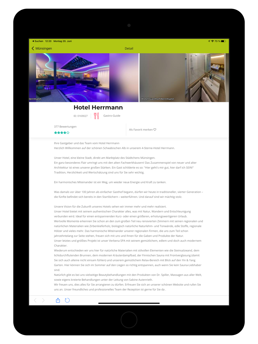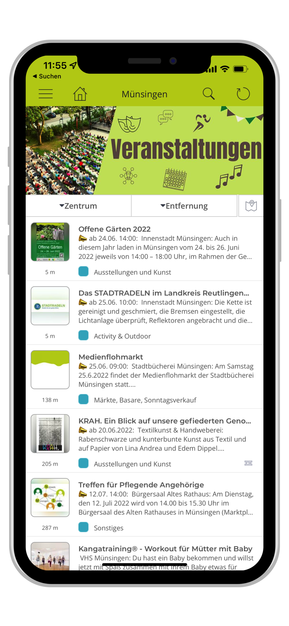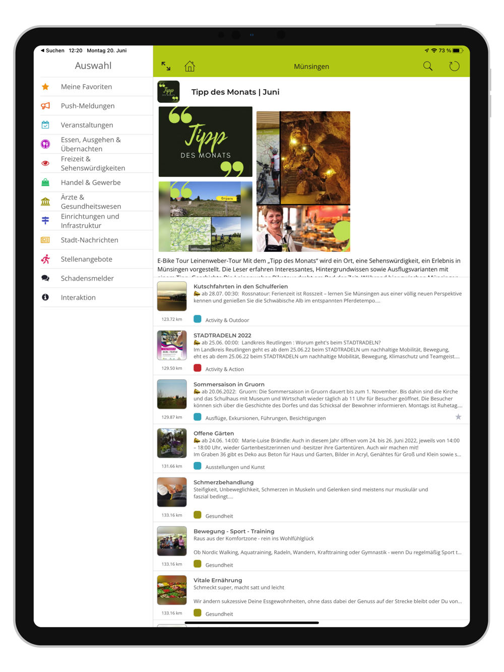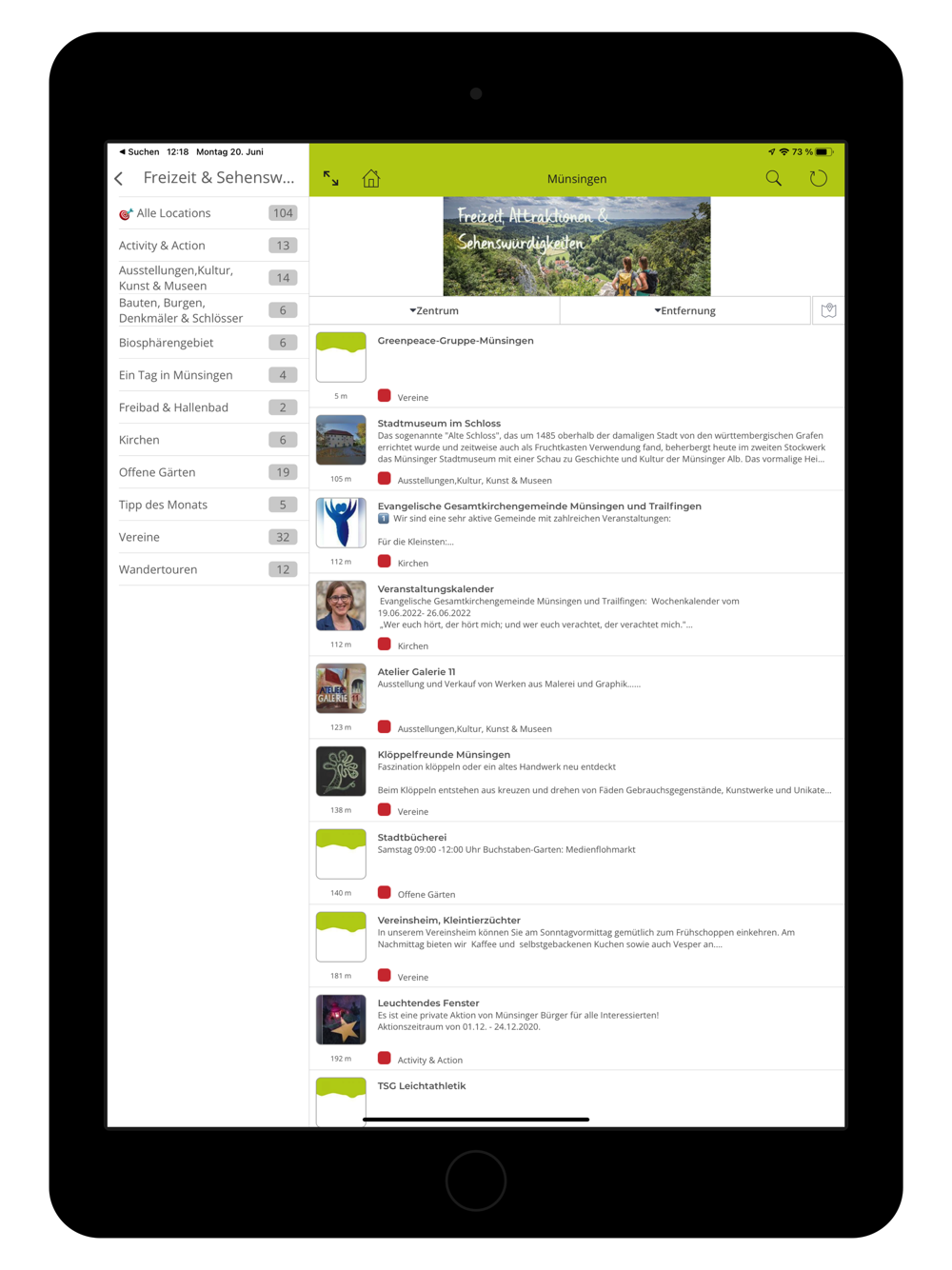 Die Münsingen App beinhaltet zu allen Themenbereichen Tipps, Eintrittspreise, Öffnungszeiten, viele Fotos zu den Angeboten, Veranstaltungen oder den Sehenswürdigkeiten und eine Karte mit Routenplaner, die Sie zum Angebot, der Veranstaltung oder zum gesuchten Standort führt.