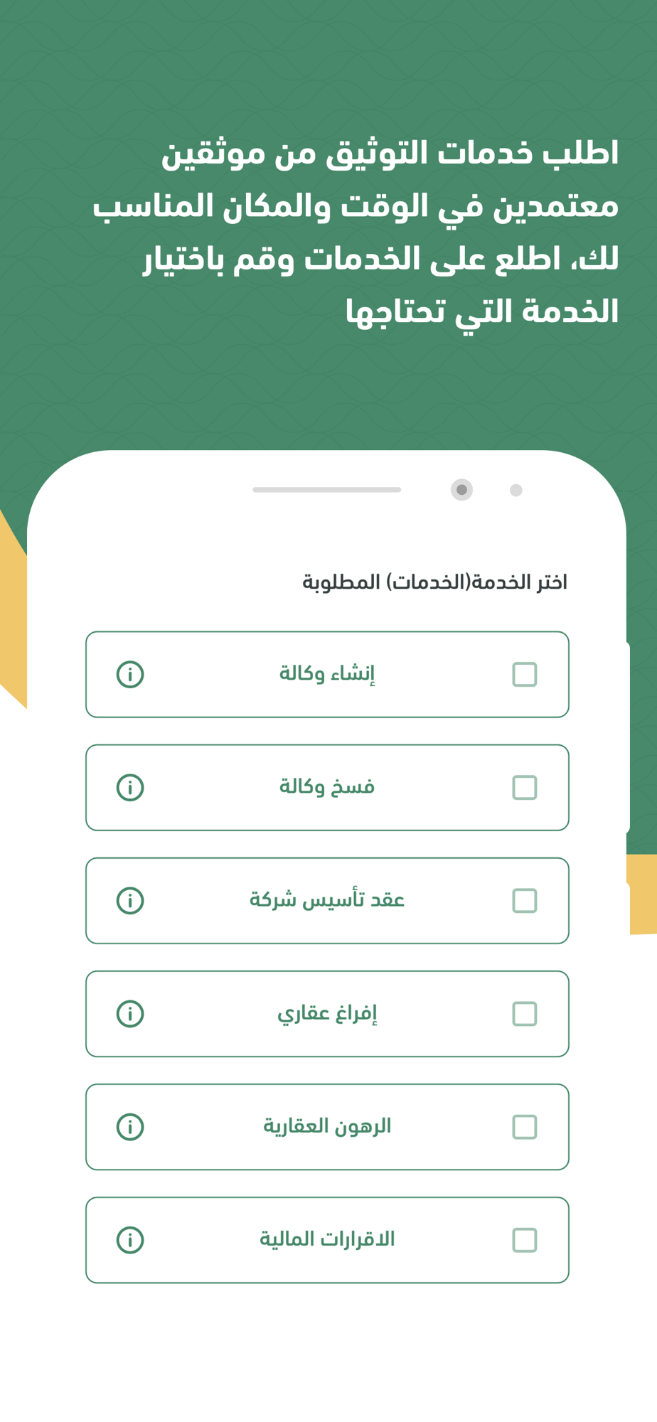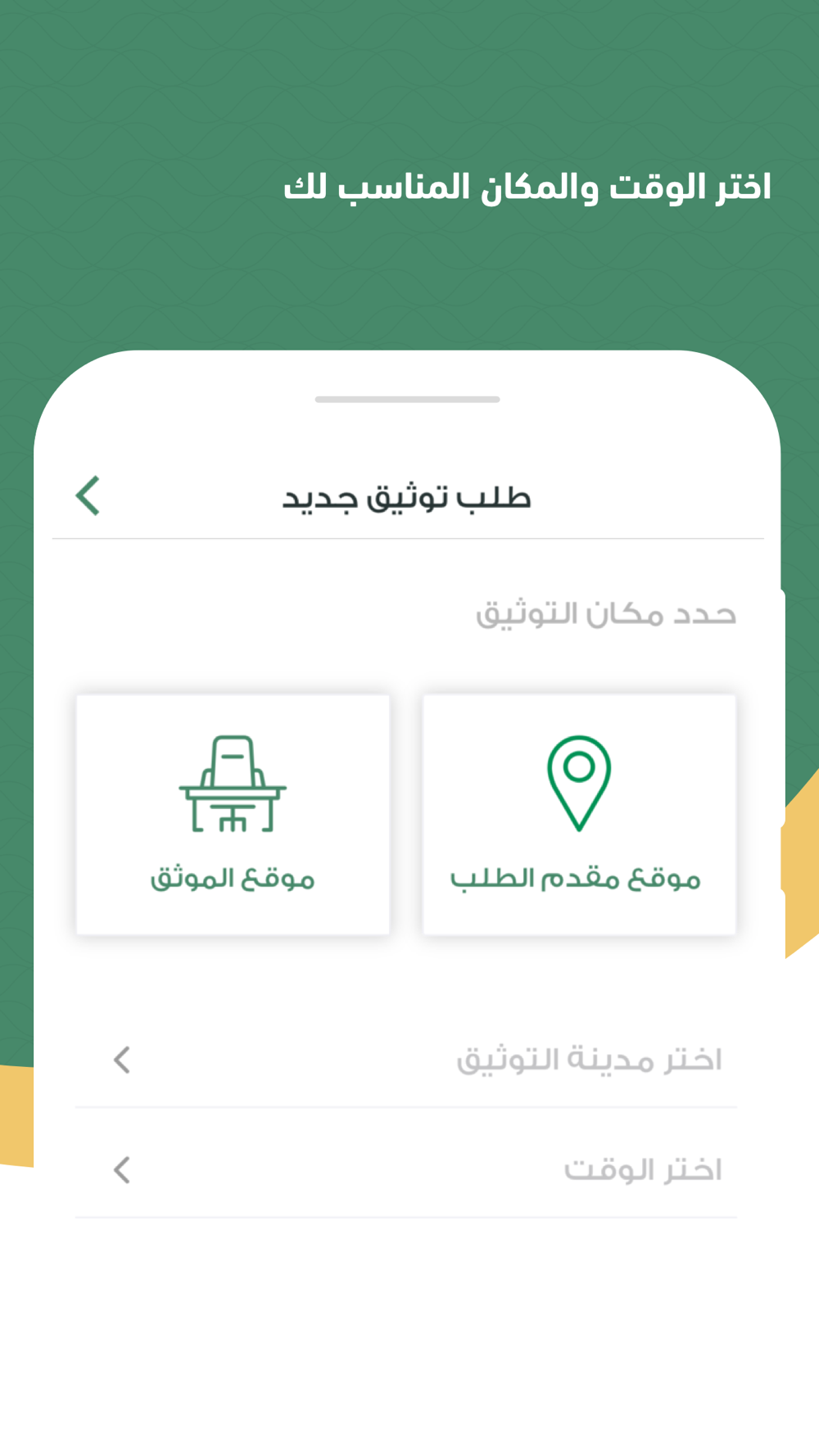 تطبيق الموثق يتيح للأفراد والمنشآت التجارية إنجاز العديد من خدمات كتابة العدل دون الحاجة لزيارتهم، عبر البحث عن موثقين معتمدين من وزارة العدل وطلب حضورهم لإنجاز أعمالك في أي وقت وأي مكان.