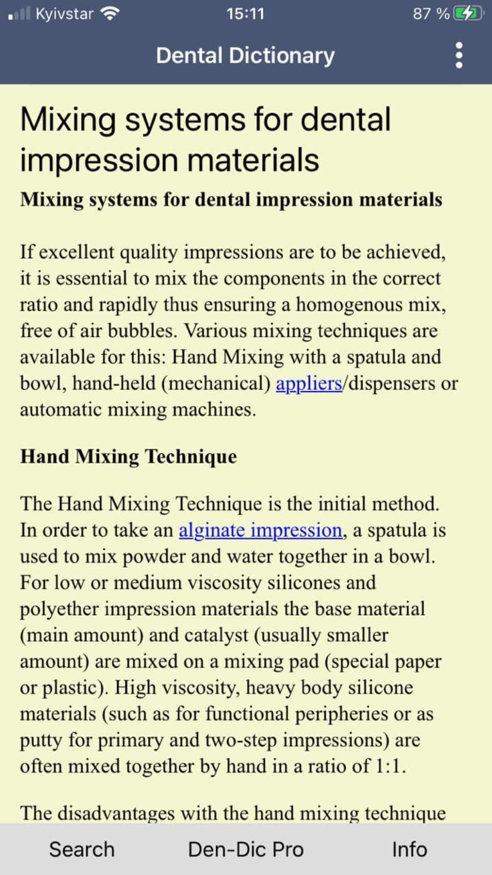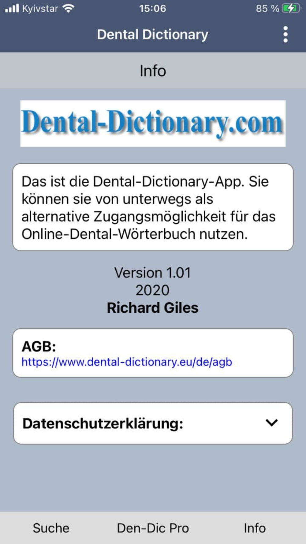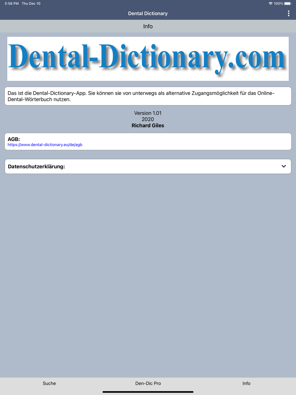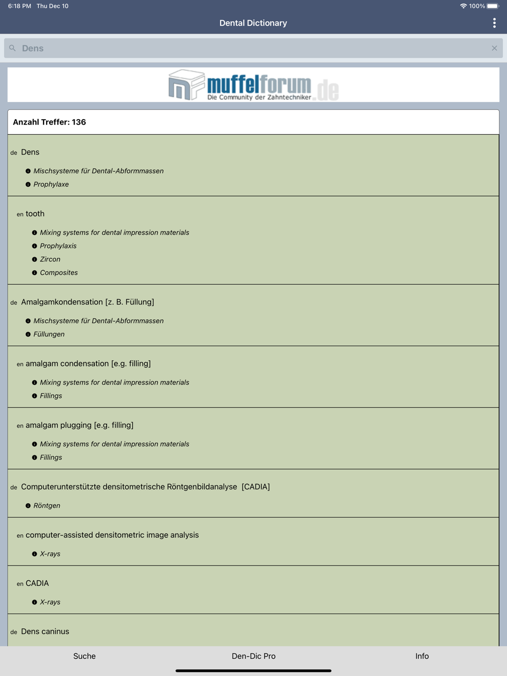 Installation and 10 searches free. In-App purchasing of further search deals. Includes focus texts with comprehensive descriptions of dental procedures, products and materials in German/English as well as illustrated information on dental manufacturers’ products. Includes advertising.
