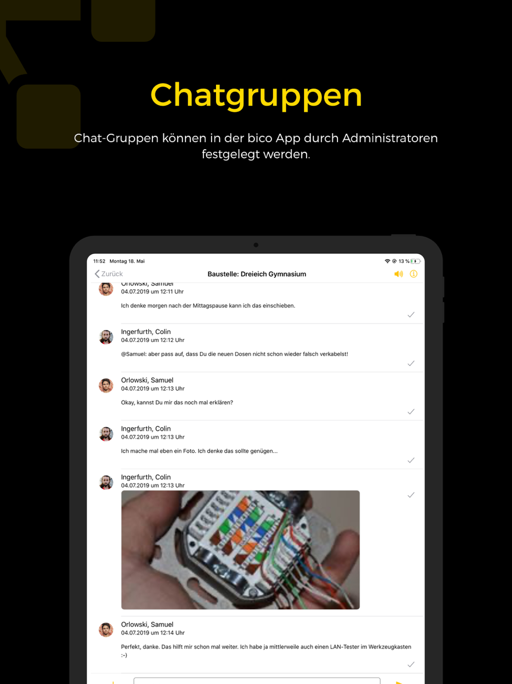 Bico bietet Unternehmen eine einfache Möglichkeit zur Kommunikation der Mitarbeiter untereinander oder auch mit ausgewählten Kunden. Da die Benutzer zentral administriert werden, ist ein Zugriff auf das Adressbuch des Nutzers nicht notwendig. Die App unterstützt somit die Unternehmen, sich DSGVO konform zu verhalten. Gleichzeitig schützt die App Mitarbeiter vor ständiger Erreichbarkeit, indem Sie Nachrichten nur während der Arbeitszeit zustellt.