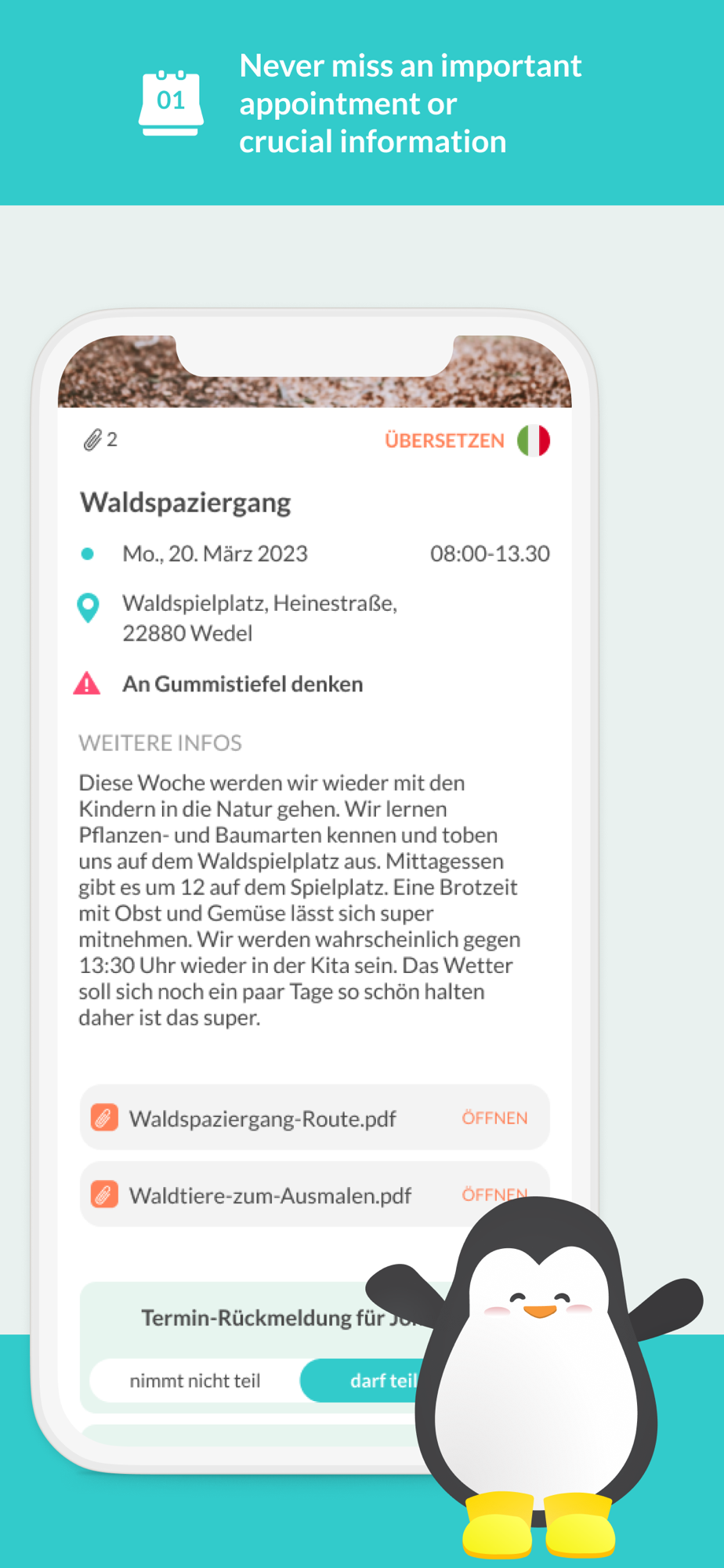 Communication with educators or other parents is also child's play. Language barriers are overcome thanks to the translation function. And best of all: you don't have to disclose any cell phone numbers. This way, organizational issues can be clarified in advance - and you gain more time for the personal conversation on site.