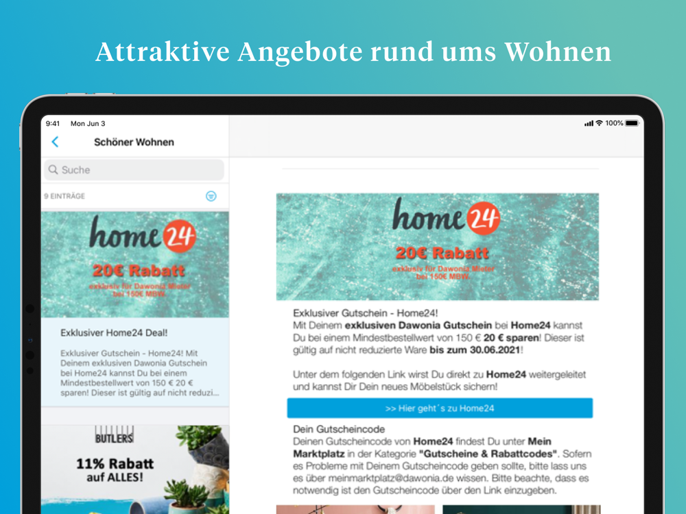 My Dawonia wurde speziell für die Mieter:innen der Dawonia entwickelt und ermöglicht einen schnellen und unkomplizierten Zugriff auf die persönlichen Mieterdaten – und das rund um die Uhr. Es werden auch weitere tolle Services wie „Mein Marktplatz“ und „Meine Nachbarschaft“ angeboten. Dort findet man attraktive Angebote rund um das Thema Wohnen und man kann sich in der Nachbarschaft vernetzen. Die App ist zudem in mehr als 25 Sprachen nutzbar!