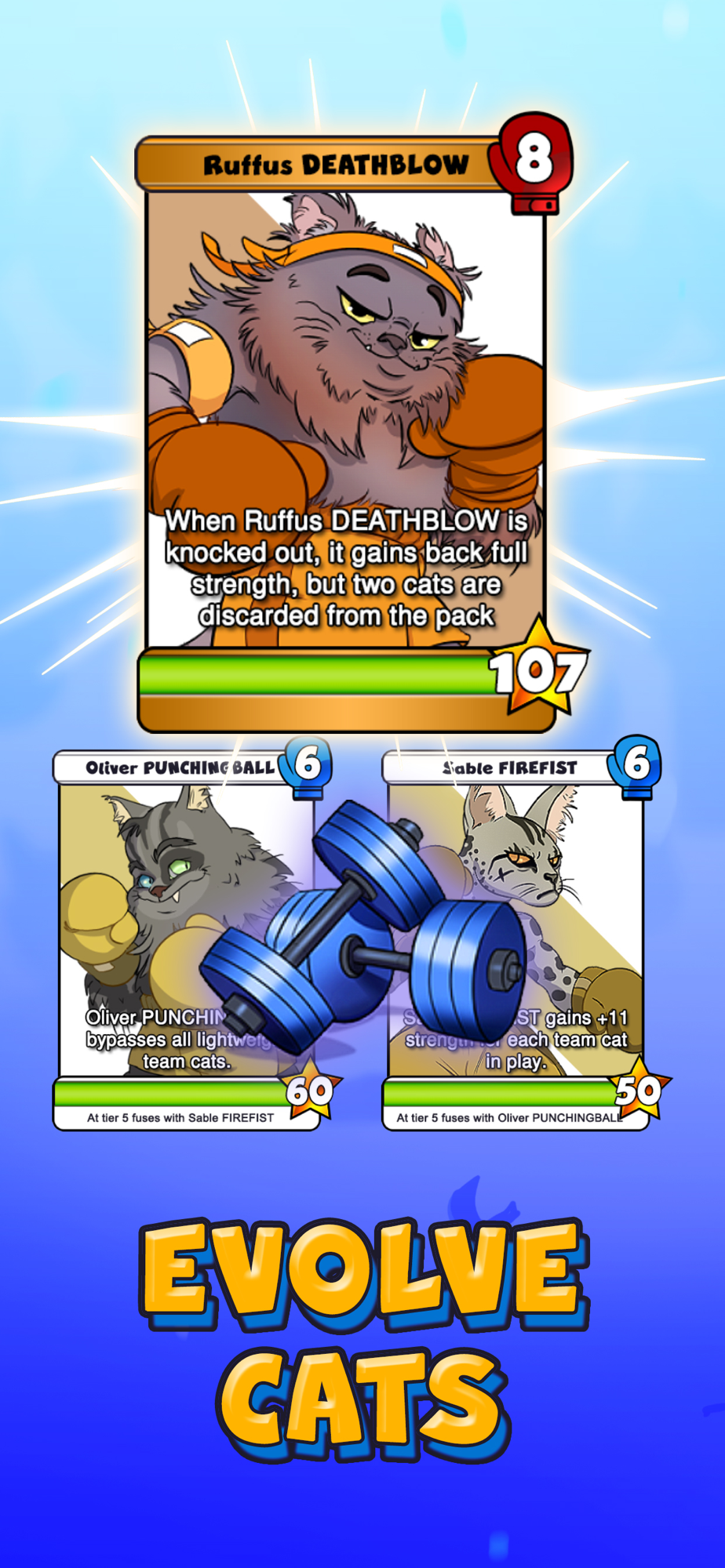 Collect, evolve and fuse boxing cat cards. Discover more than 100 cute, mean, proud, cocky, crazy, angry, thrashed, flirty boxing cats and boxing cat managers. Set up boxing fights in your neighbourhood's venues and unlock more venues on the map. Become the greatest boxing cat manager of all time. Build boxing cat card decks to attack other managers and to fend off their attacks. Climb up the monthly boxing cat managers' rankings. Game Features: - easy onboarding for clumsy cats - fast progression for sneaky cats - AI fights for cowardly cats - real fights for brave cats (sort of) - boxing cat gyms to be conquered and defended - best boxing cat card deck wins (often) - monthly boxing cat managers' rankings - 100+ boxing cat cards with sundry cat races and moods Boxing Cats is free to play, but game currency can be purchased for real money. You can disable in-app purchases in your device's settings. A network connection is required to play.