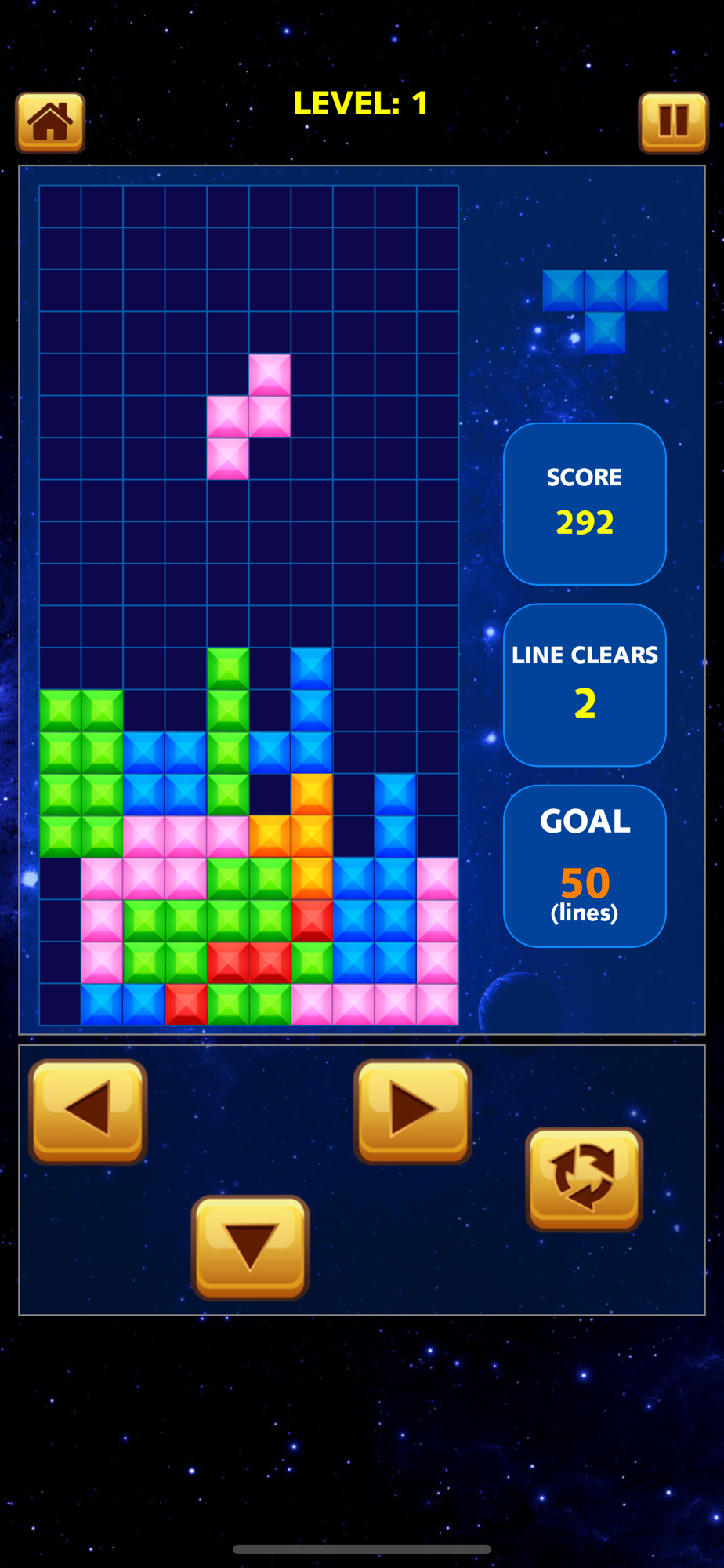 There are ten levels in each mode, from easy to difficult for you to clear. The falling speed of the tetrominos are faster and faster after each level. You should gain as much as possible the scores.