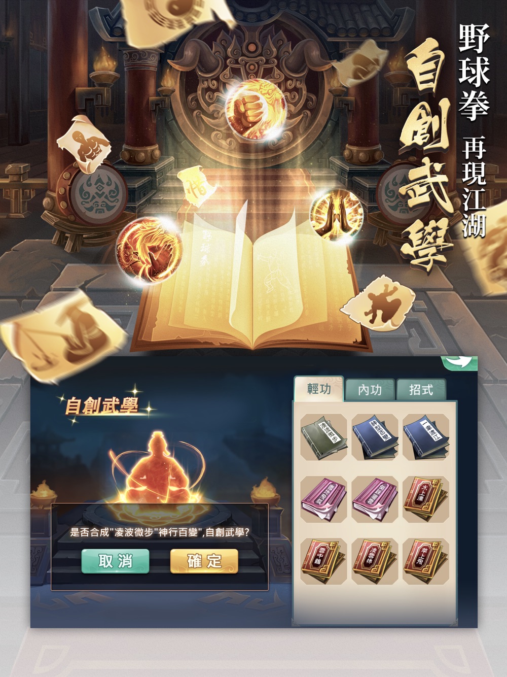 江湖流傳著上百種武學、絕學、步法及內功心法秘笈,如何選擇最適合自身的武學招式?將各路知名武學截長避短,創造出專屬的自創武學!"天下無難事,只怕野球拳"傳說重現,自創與經典武學兩方對決,搭配出專屬於自己的武功套路,成就武林傳奇!