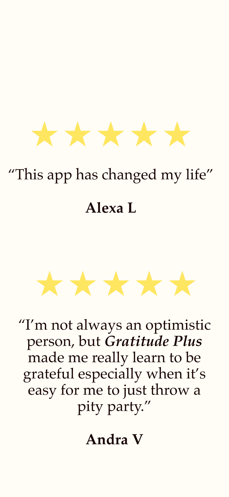"I love Gratitude Plus because unlike other gratitude apps I've used, it isn't clogged with unnecessary features or annoying alerts. It does exactly what I want a gratitude app to do all and has a clean, soothing design"