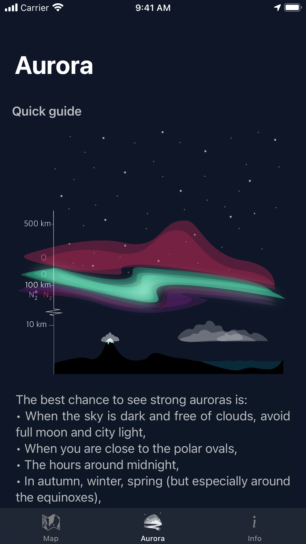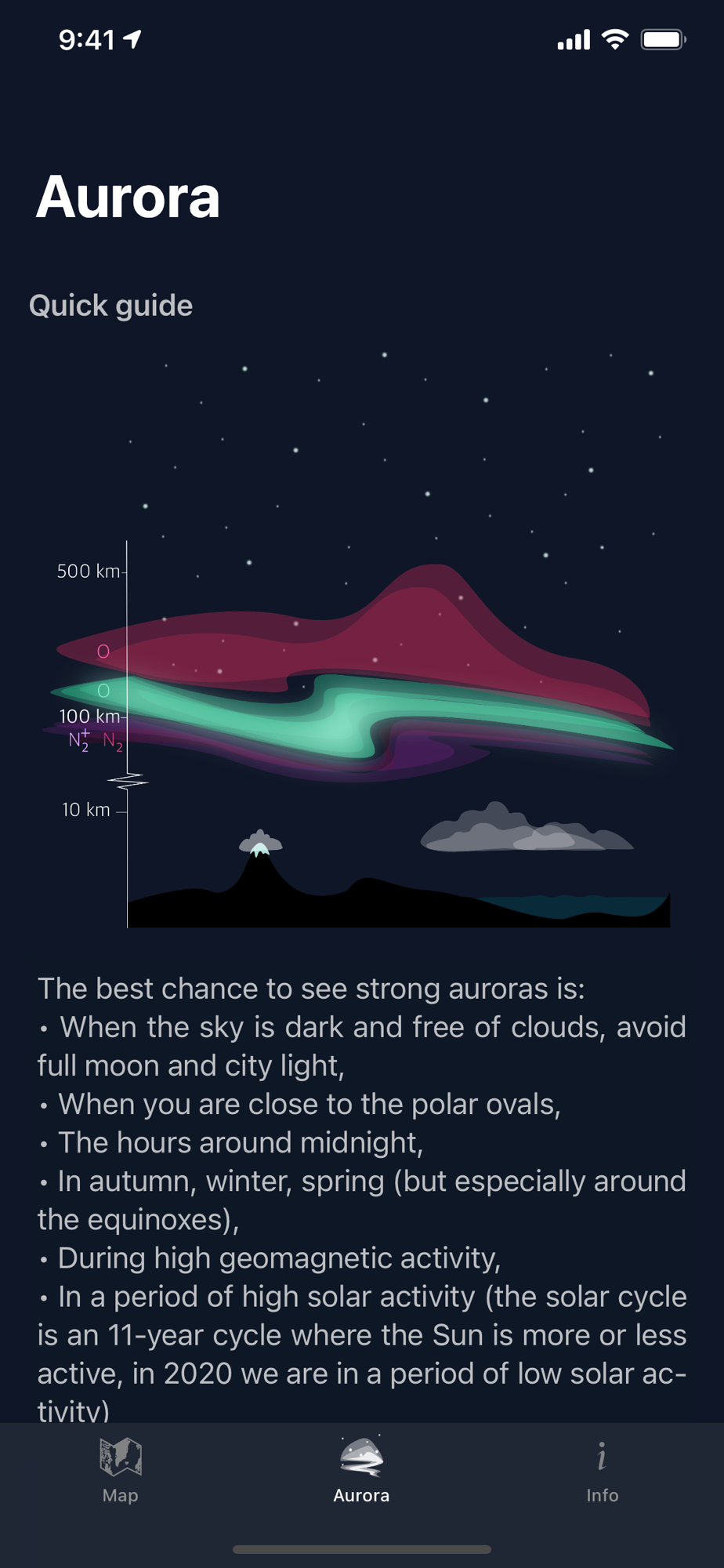 • Notifications when it is likely to see the aurora near you - based on actual measurements from a nearby station. This feature is possible if you live in Greenland, Faroe Islands or Denmark.