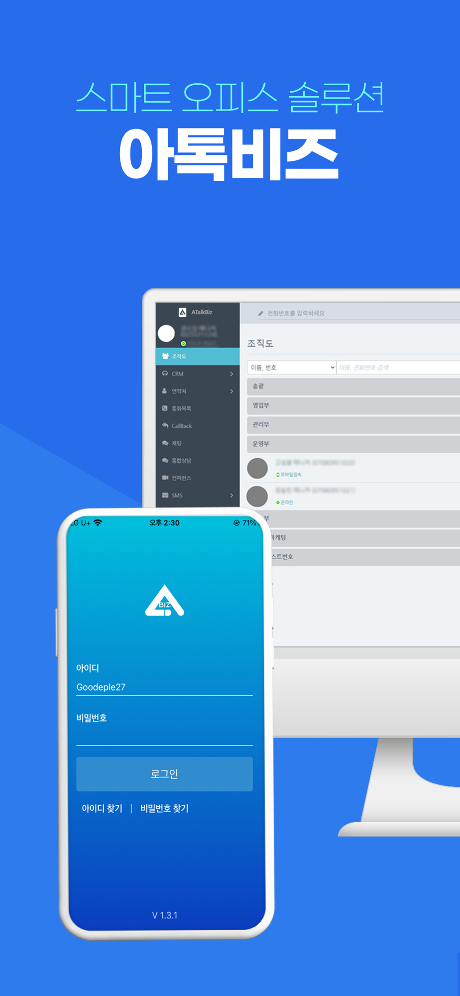 ■ 아톡비즈 서비스는 어플 내에서 회원 가입을 하실 수 없으며, 아톡 기업용 가입자에게 제공 되는 애플리케이션 입니다. ㈜굿텔레콤에서 발급받은 ID정보로 로그인 하시기 바랍니다.