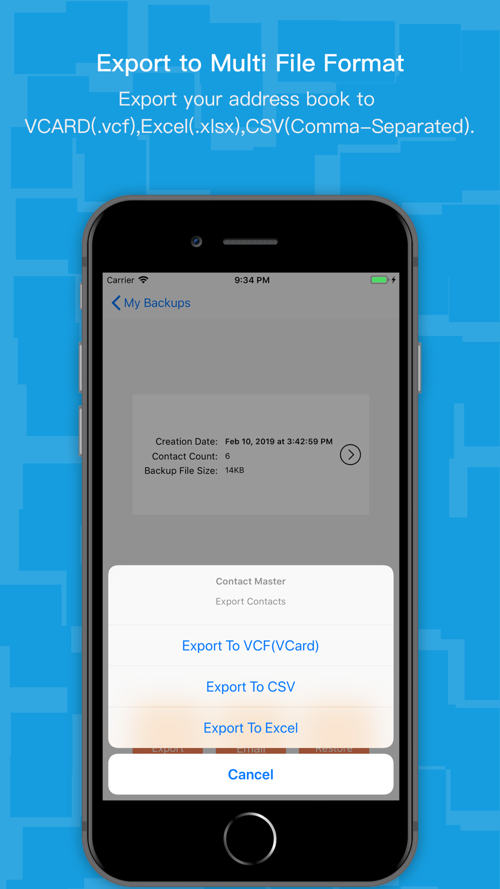 ○ Easy restore. No need to use any app to restore backup file. Just tap on the *.vcf backup file in the iPhone, iPod Touch or iPad mail client.