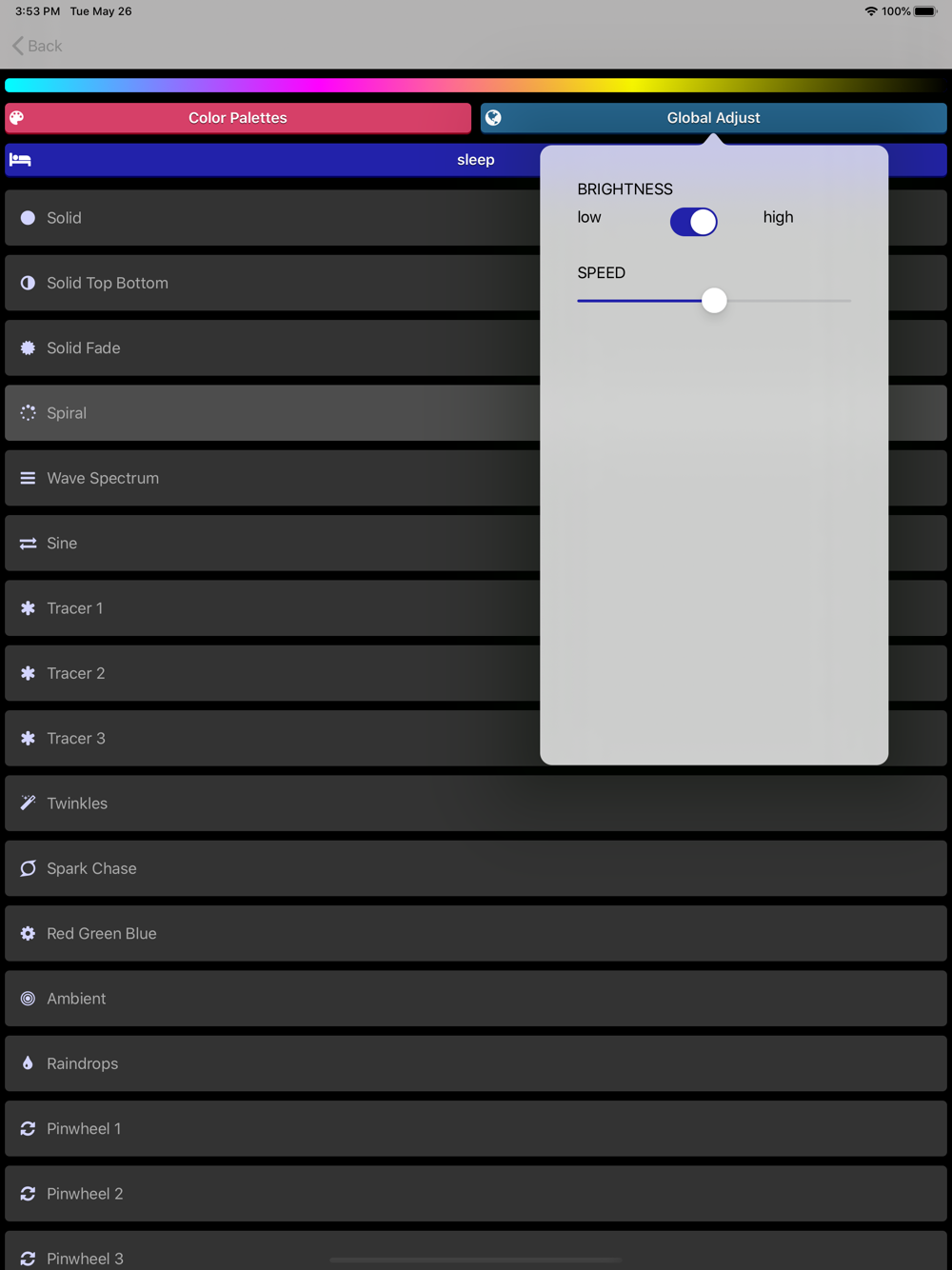 The UbaTuba Glass App is the interface for direct control of the LED lighting system inside a Living Light Sculpture. It works over bluetooth. As long as the sculpture is plugged in and your iPhone or iPad is close by, the sculpture's name will appear in the list on the main screen. Select it, and easily change the animation patterns. Adjust global brightness and animation speed. You can choose a pre-defined color palette or make your own. Currently available for iOS only.