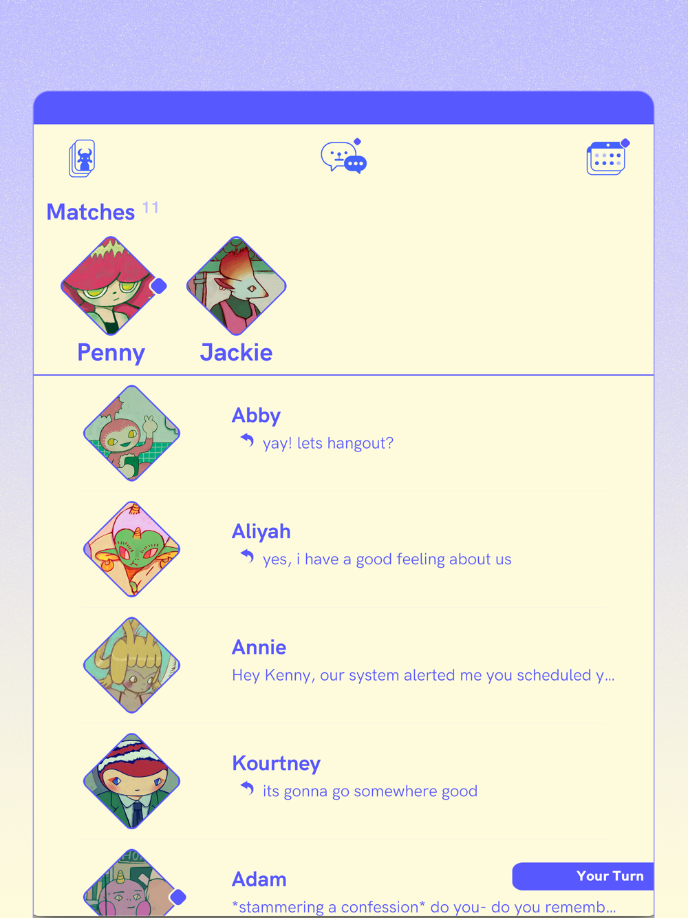 Tender is a narrative game that explores connection and rejection in the era of swipe culture. It’s a story told by and through the modern interface for finding love.