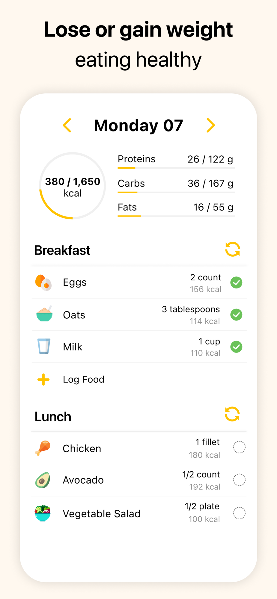 - If you don't find something in our database, you can create your own healthy recipes and foods and track them in your plan.
