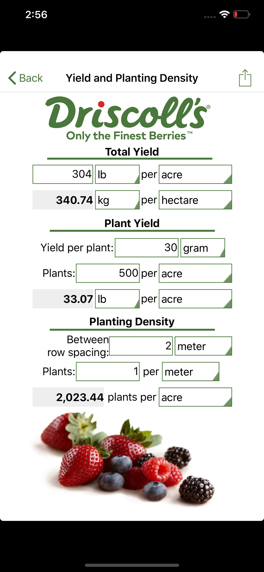 Driscoll’s BerryCalc application is a calculator used to convert values from US Customary to/from Metric measurement systems. The application includes crate calculations per Berry type, common calculations used for field operations, and yield/planting density. Conversions for area, conductivity, density, energy/work, length, mass flow rate, temperature, volume, volume flow rate, weight and weigh/area are included.