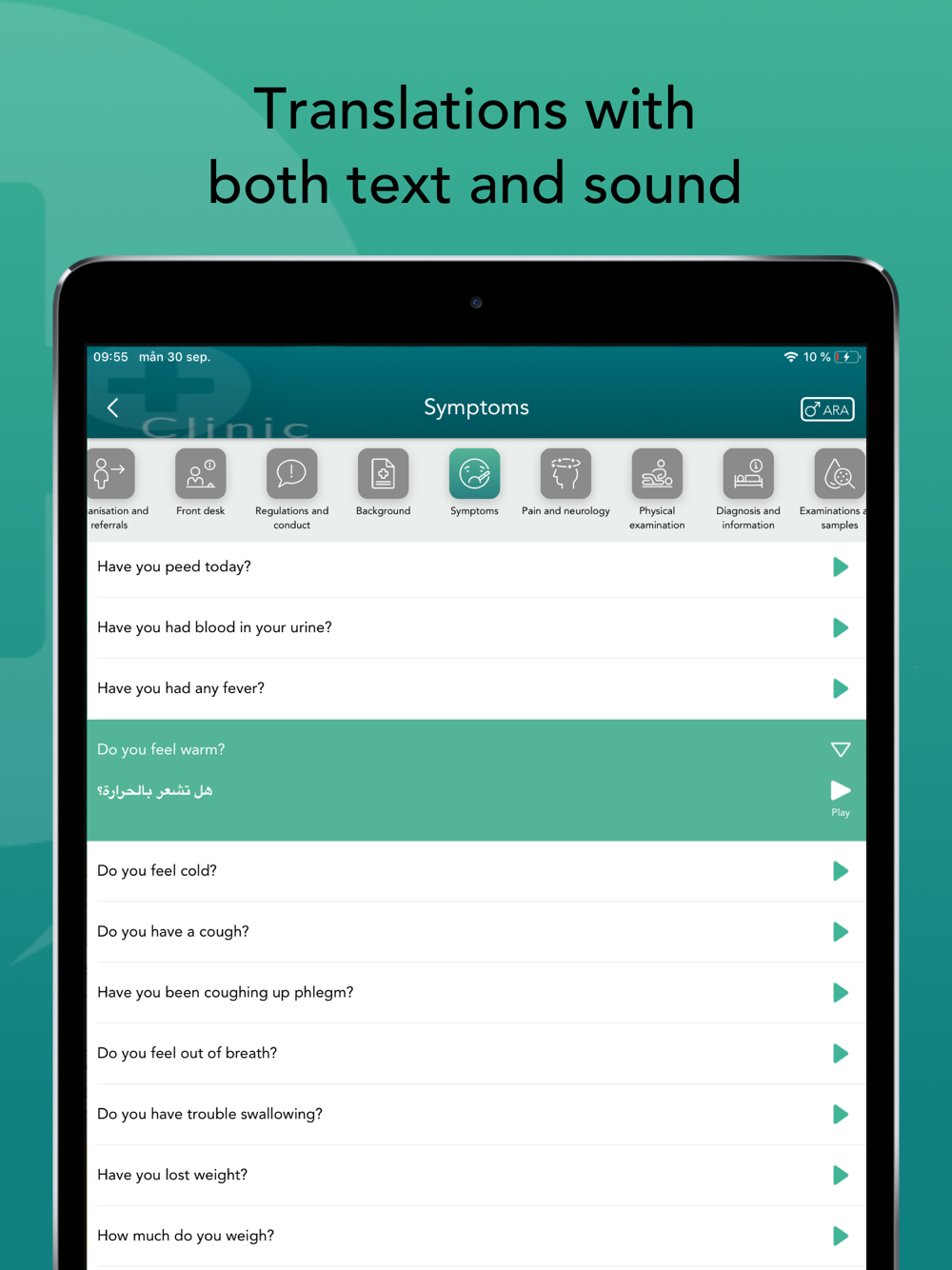 We strengthen the patient’s safety by offering medically correct communication with translations verified by native speakers. Our app can be used in emergency situations or in daily work at the ward.