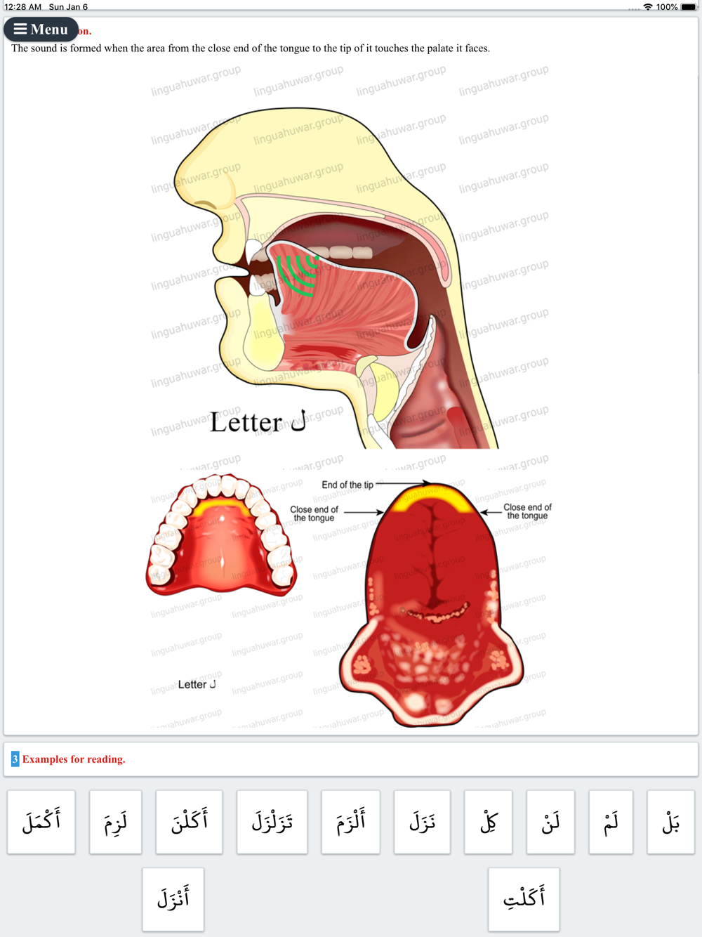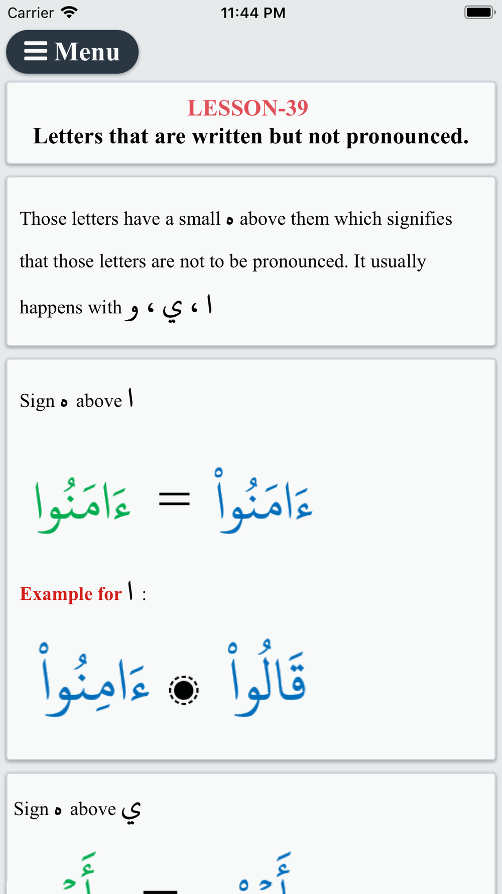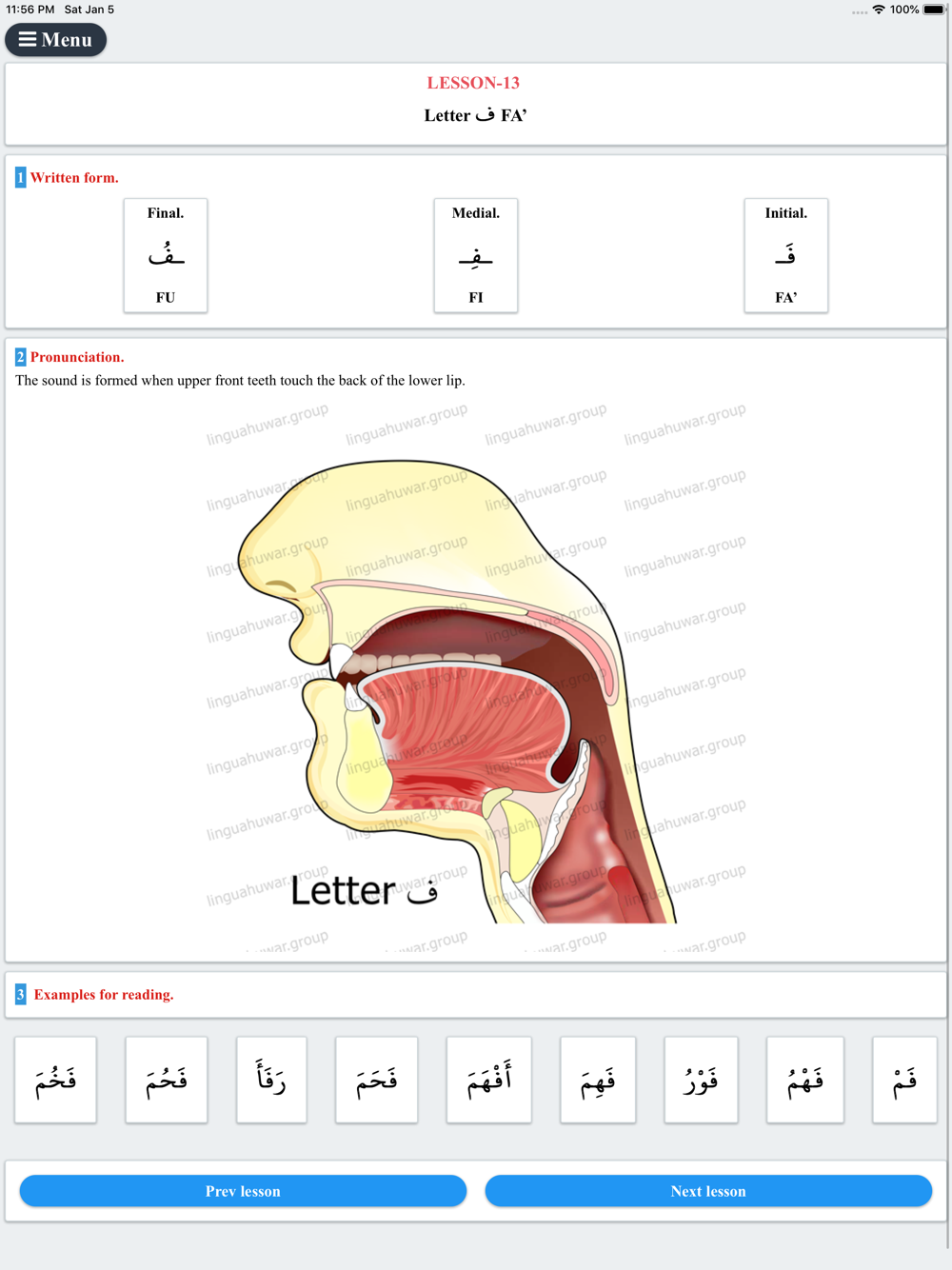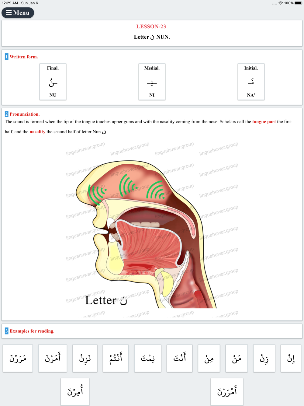 This app is self-teaching. The content is written in simple way so that it's possible for the user to learn every lesson without a teacher. There are 41 lessons in this app. After studying all the lessons, you will be able to read any arabic text with diacritics.