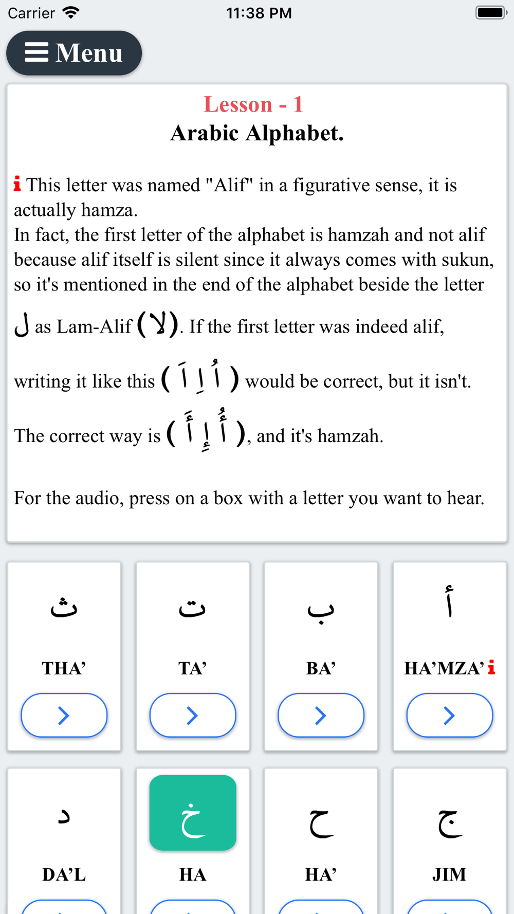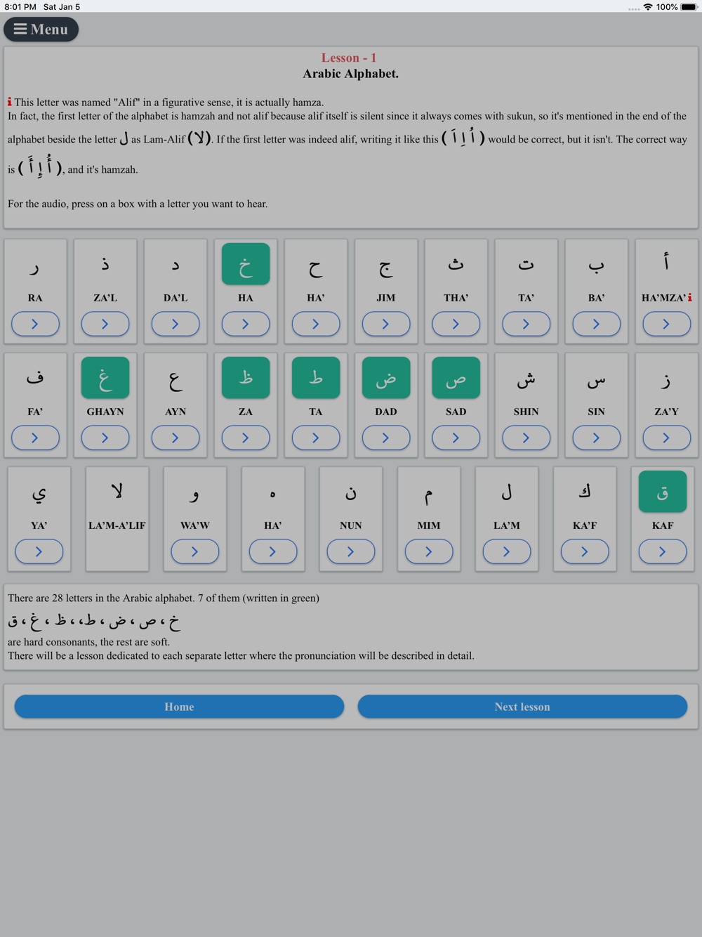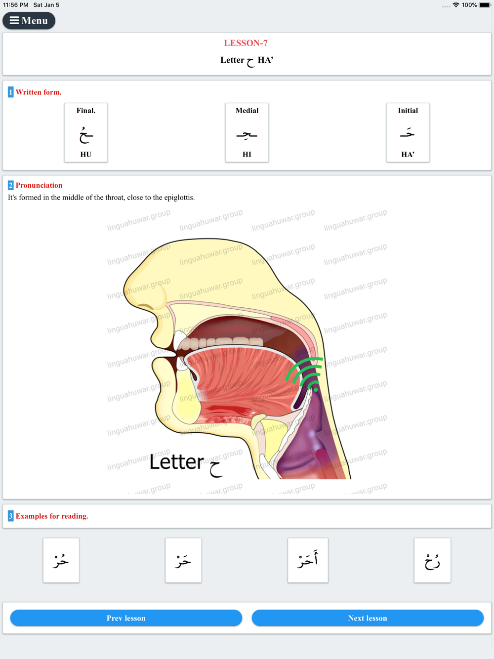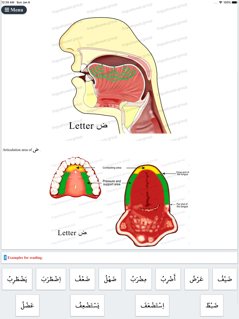 This app is self-teaching. The content is written in simple way so that it's possible for the user to learn every lesson without a teacher. There are 41 lessons in this app. After studying all the lessons, you will be able to read any arabic text with diacritics.