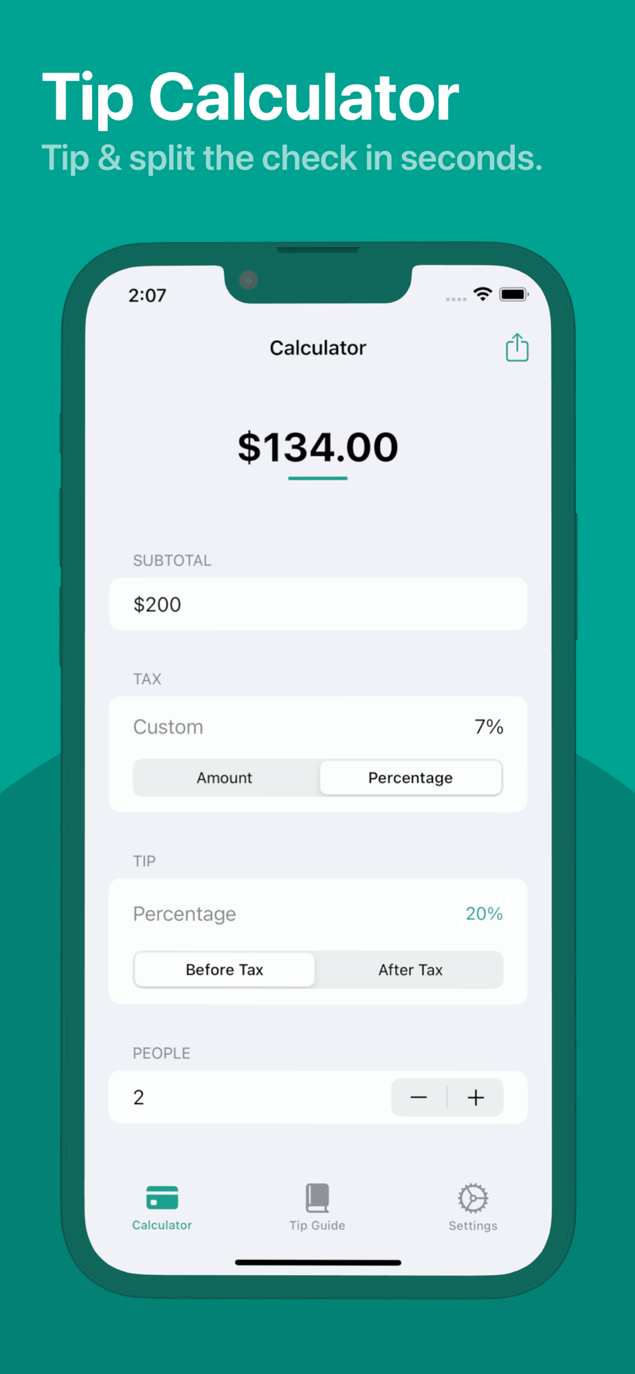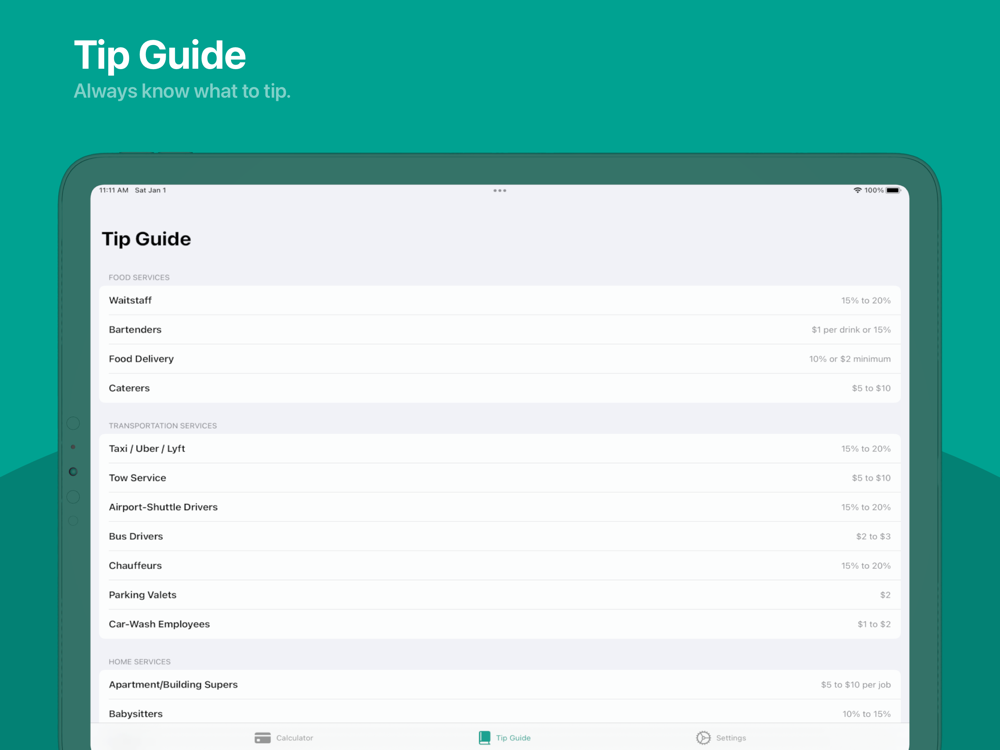 TipCalc is a fast and easy-to-use tip calculator for the iPhone, iPad, Apple Watch and Mac. Quickly calculate your tip, tax, split bills up to 100 people, and share your expenses with others in a matter of seconds. Always know what to tip with the convenient Tip Guide.