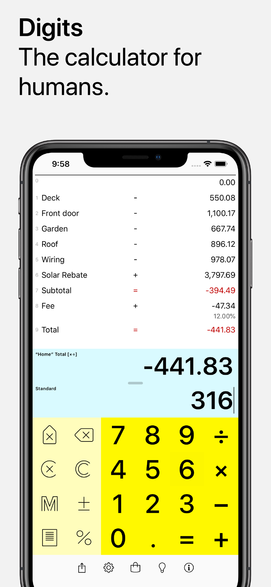 We're human. We're busy. We make mistakes. So we designed a calculator for humans, from the ground up. Digits combines the editability of a spreadsheet with the simplicity of a calculator. Digits is a calculator a human can love.