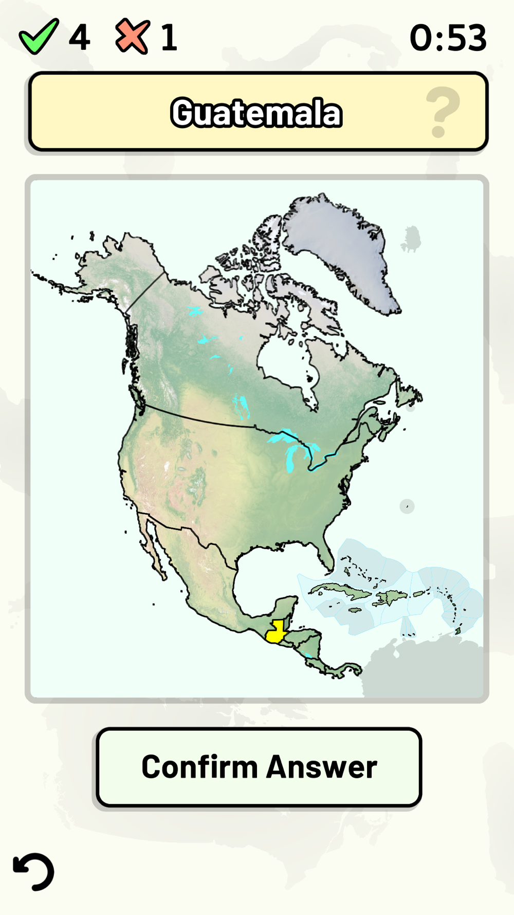 Customizable quizzes allow you to choose which North American countries to test, as well as the topic. Past results for each country are displayed to highlight your progress at each topic.