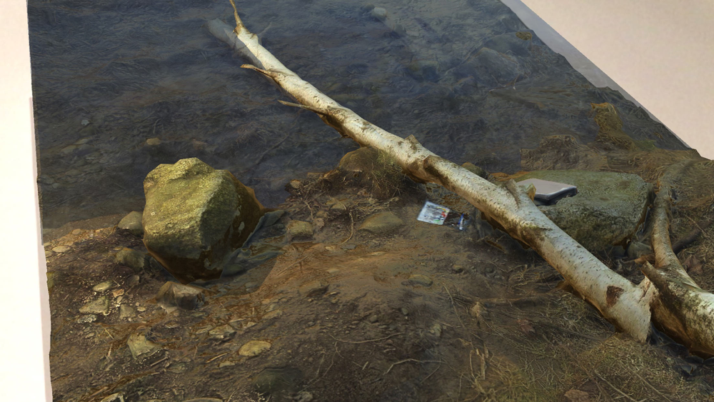 The River Edge [49.065351N, 122.849944W]. Installation: Photograph on platform. 3D scans, vide, audio, AR