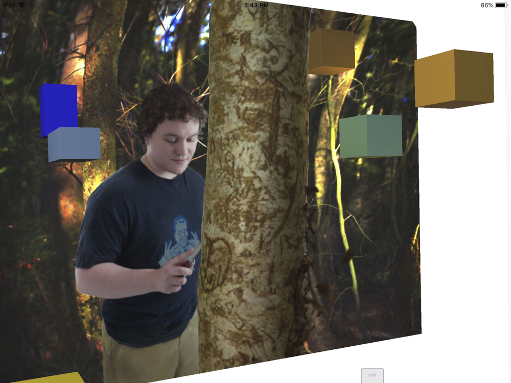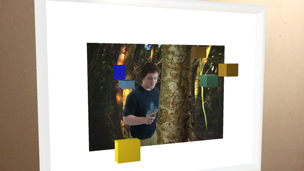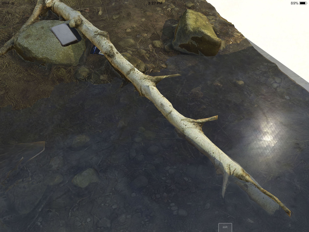 Viewers can scan the photographs: “The Carved Tree” or “The River Edge” in the gallery space using the App, and interact with the scene in Augmented Reality to reframe the composition from different points of view. Through this virtual view, viewers can move in for a closer look, or look behind objects to reveal elements not initially visible in the original photo. Ironically, since the viewer must move around the photograph to fully see it, this virtual medium creates the potential for active, physical interactions with the immaterial digital capture.