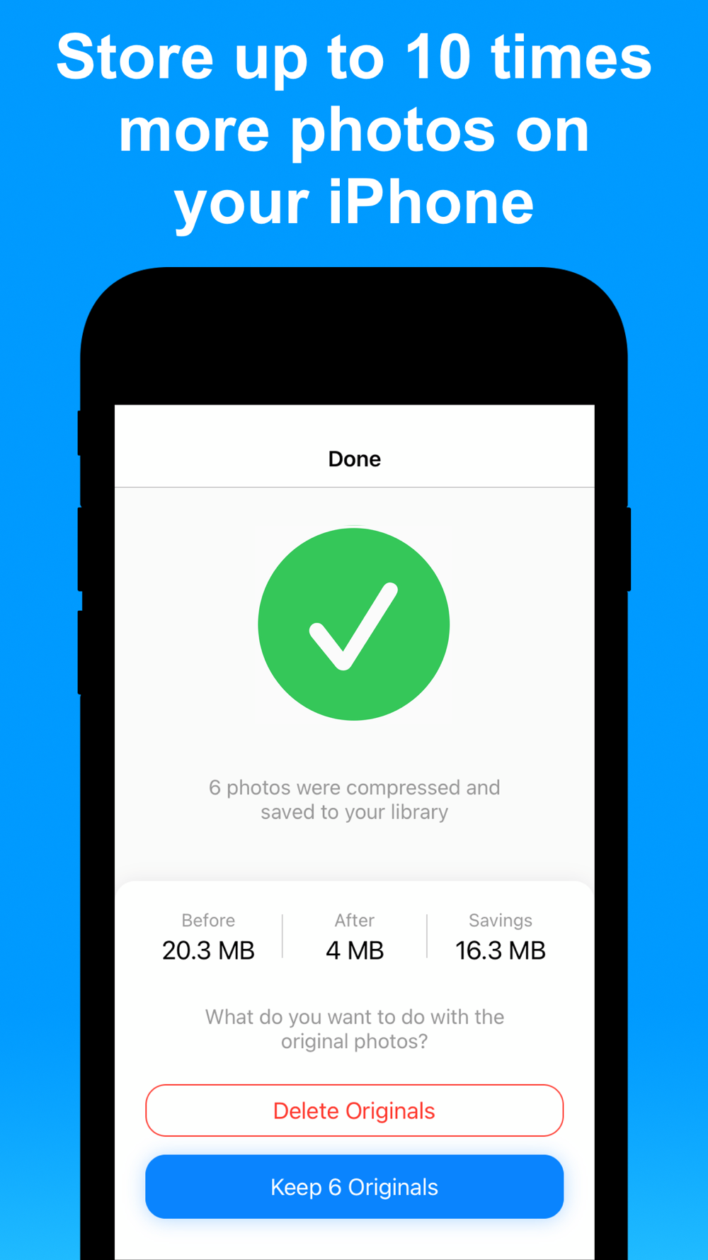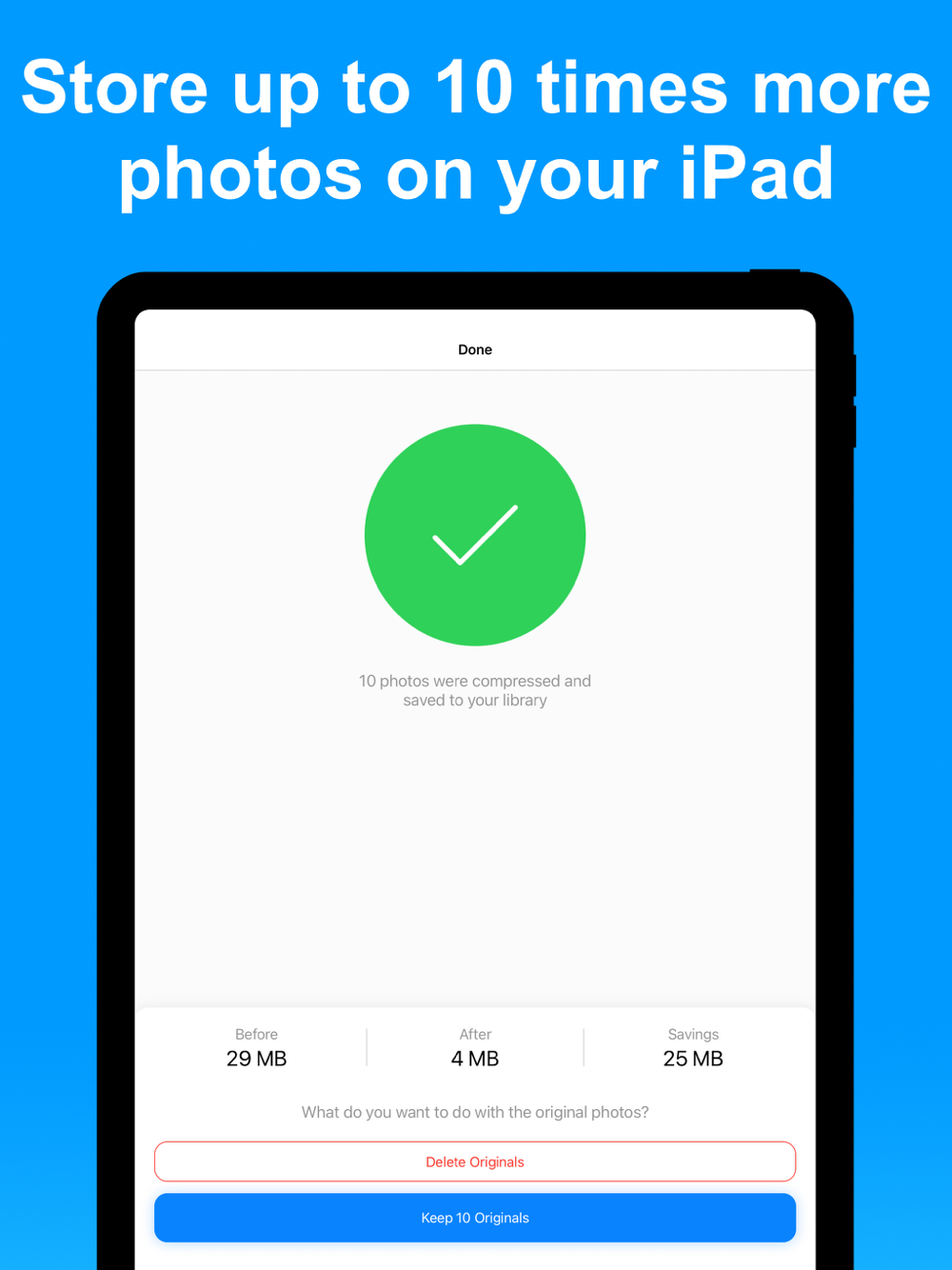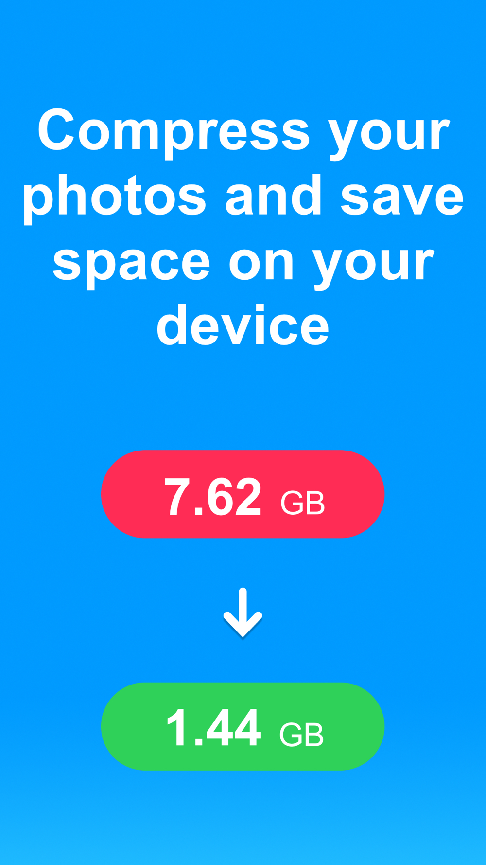Use Compress Photos to shrink the file size of photos and regain storage space on your device. When applied to all your pictures, Compress Photos can help you store up to 10 times more photos on your iPhone or iPad.