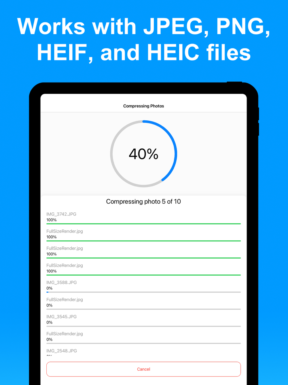 Compress Photos works with all PNG, JPEG, HEIF, and HEIC image files.