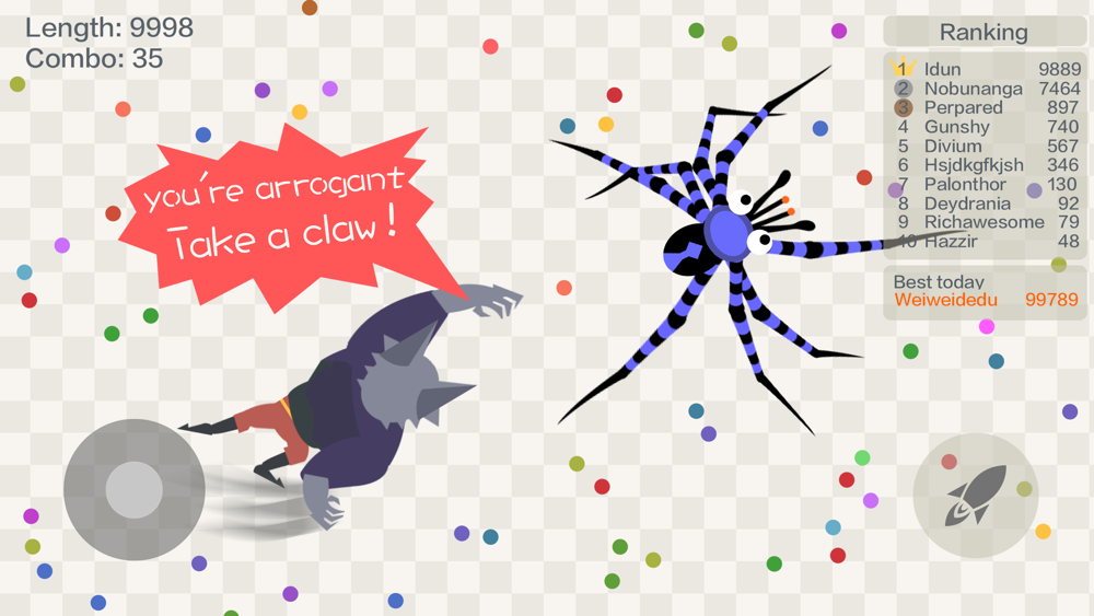 1. Control the rocker to walk your snake, eat the color dot on the map, it will become longer.