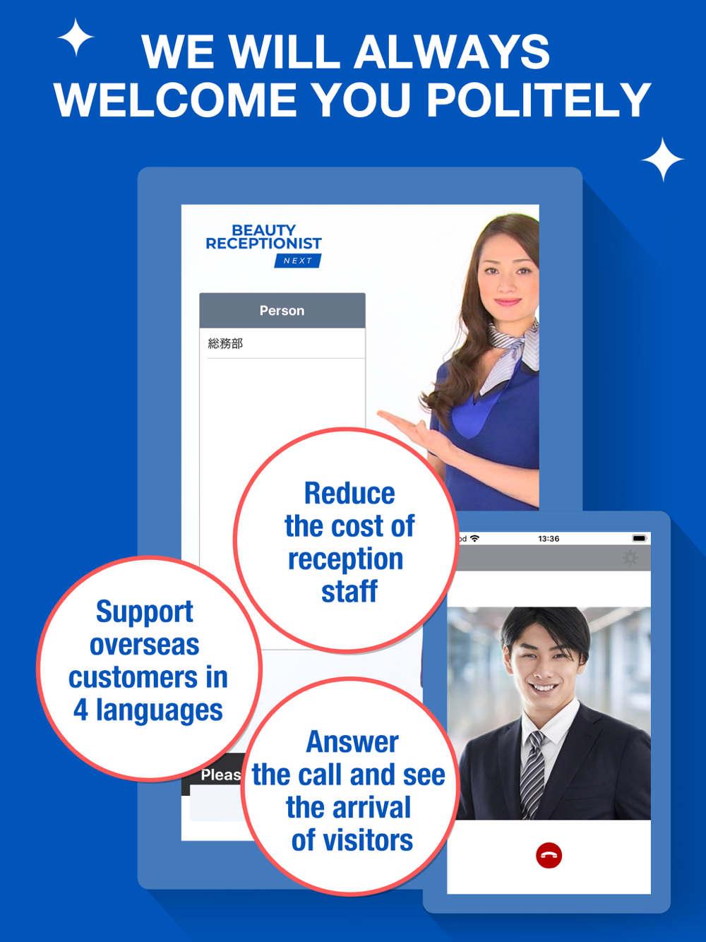 If you import a beauty receptionist, you will no longer need a receptionist. The visitor only needs to tap the iPad and then press the call button. The receptionist in the app will smile and call the person in charge.