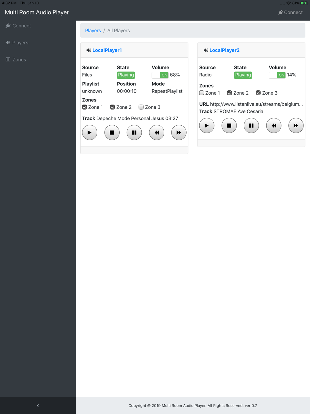 The official Multi Room Audio Player application provides remote control for the main desktop software. In order to use this application, you need to install the main software from our website multiroomaudioplayer.com