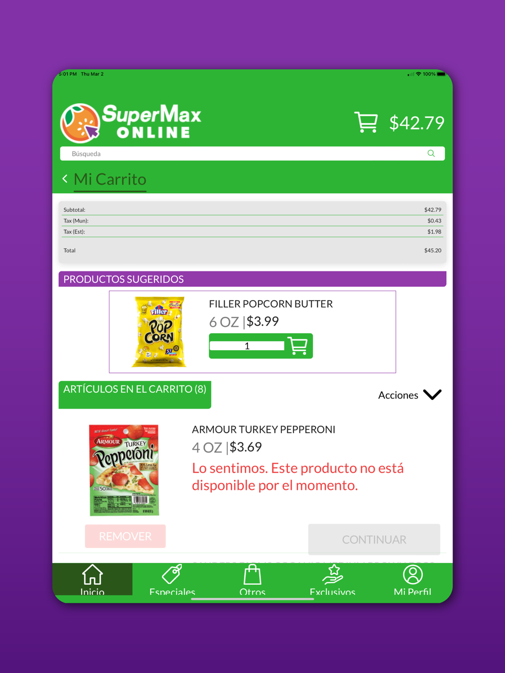 SuperMax te provee una plataforma para compras Online donde puedes seleccionar una variedad de productos de todos los departamentos de nuestro supermercado, fácil, conveniente y seguro. Con servicios de entrega y recogido el mismo día.