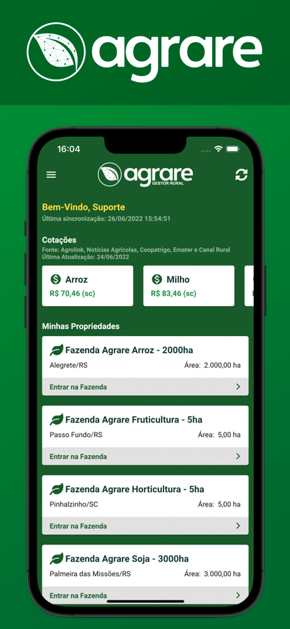 Olá! Seja bem-vindo(a) à AGRARE, a sua plataforma para potencializar o sucesso da sua fazenda.Estamos sempre trabalhando para trazer a melhor experiência na gestão da sua propriedade rural. Confira o que preparamos para você:- Correção sincronização localidade fazenda- Área talhão na pesquisa- Melhorias Gerais no App.Atualize agora mesmo e aproveite todas as melhorias!