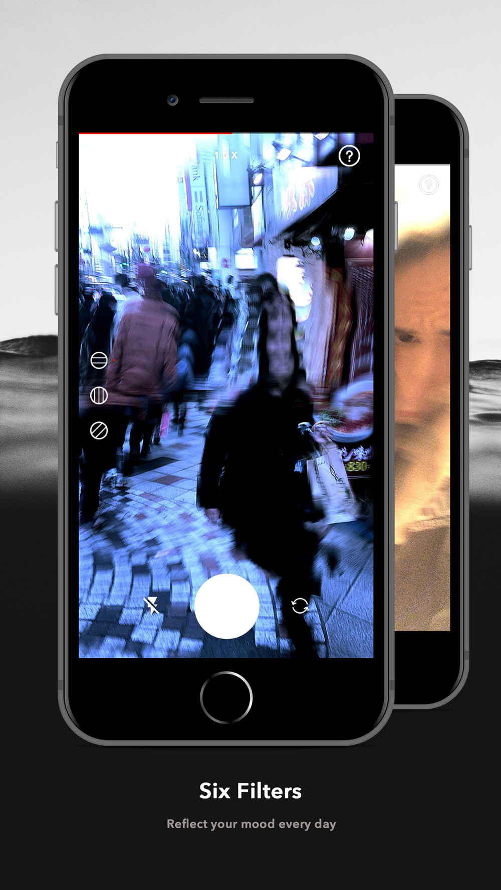 First of all, please tap the button and take a picture. You can shoot pictures with analog texture and unique blur. Also, before taking a picture, you can change the slit pattern from the left menu and switch some color filters with the left and right swipe. Please switch filters according to environment and mood.