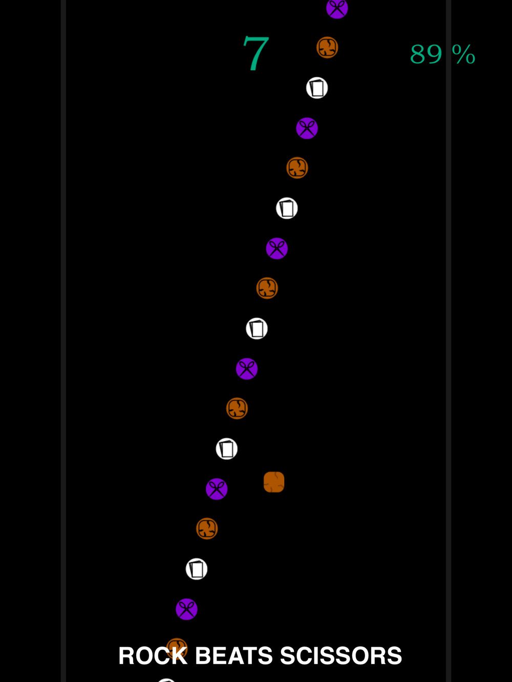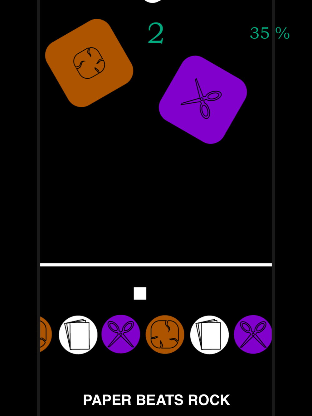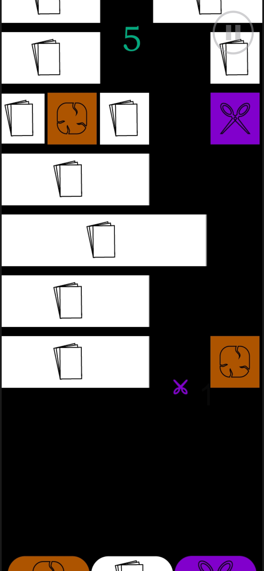 Classic Rock Paper Scissors (rochambeau) twisted into an avoidance game. Your character is either the Rock, the Paper or the Scissors and you need to slide left or right to chose the correct pathway and get through the obstacle.