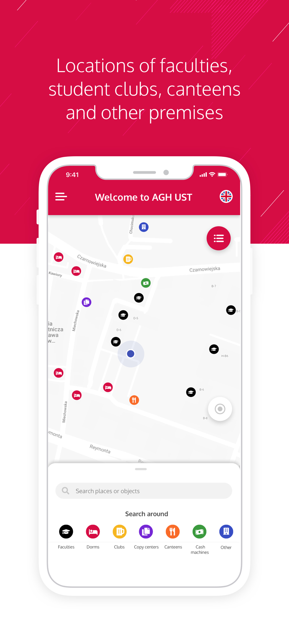 ‘Welcome to AGH UST’ app is addressed to all international students who arrive at the campus for the first time, but also to candidates willing to study at the AGH University of Science and Technology. Its main goal is to help students to move around the AGH UST Campus and provide them with indispensable information including opening hours of Deans’ offices, locations of AGH UST premises (faculties, dormitories, sport facilities, student clubs, copy centres, canteens and many more) with the function of navigation, events and news connected with student life as well as information about Krakow and its top attractions.