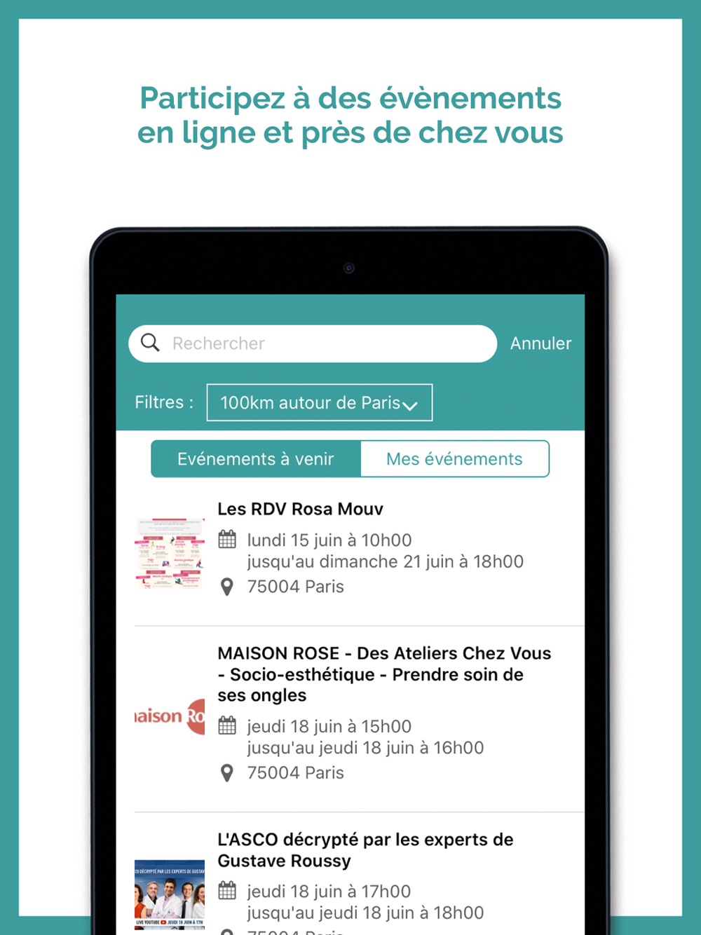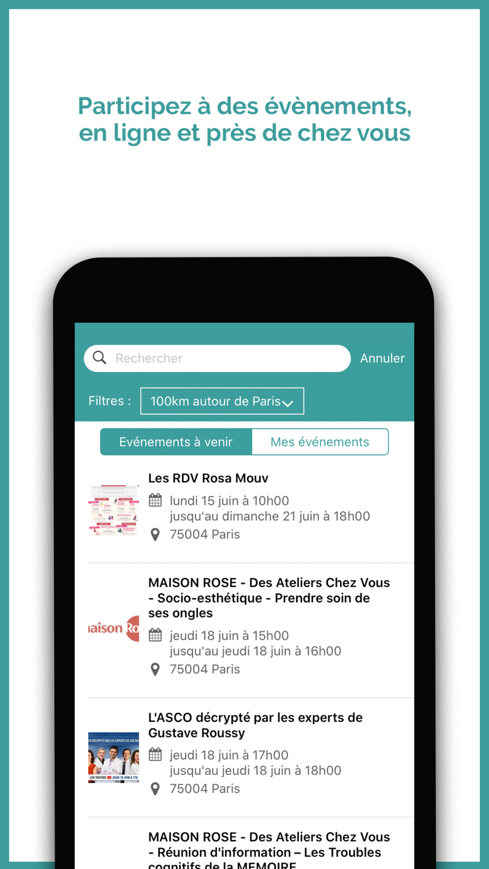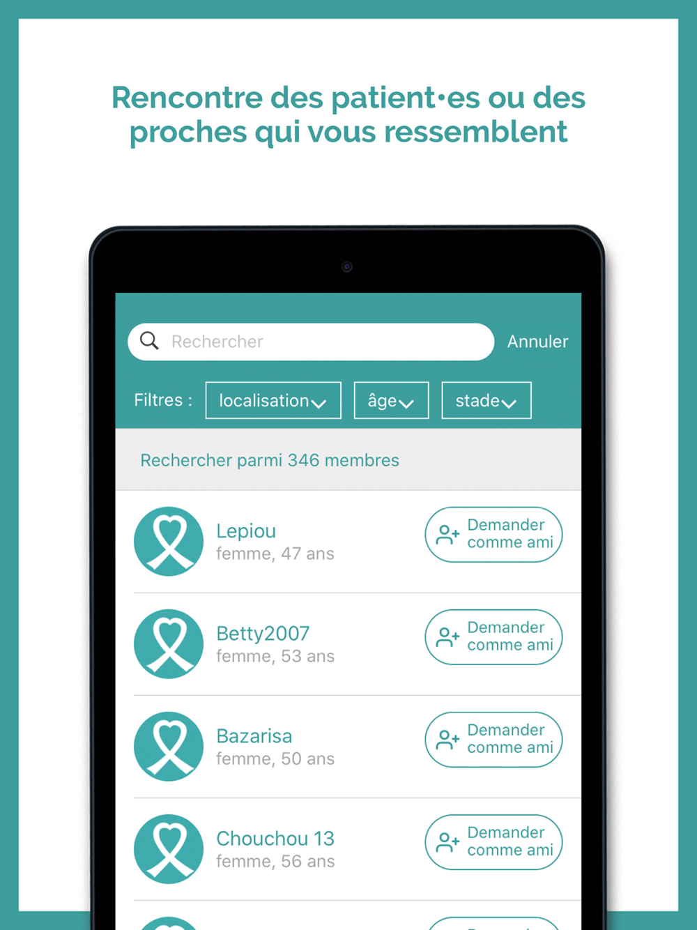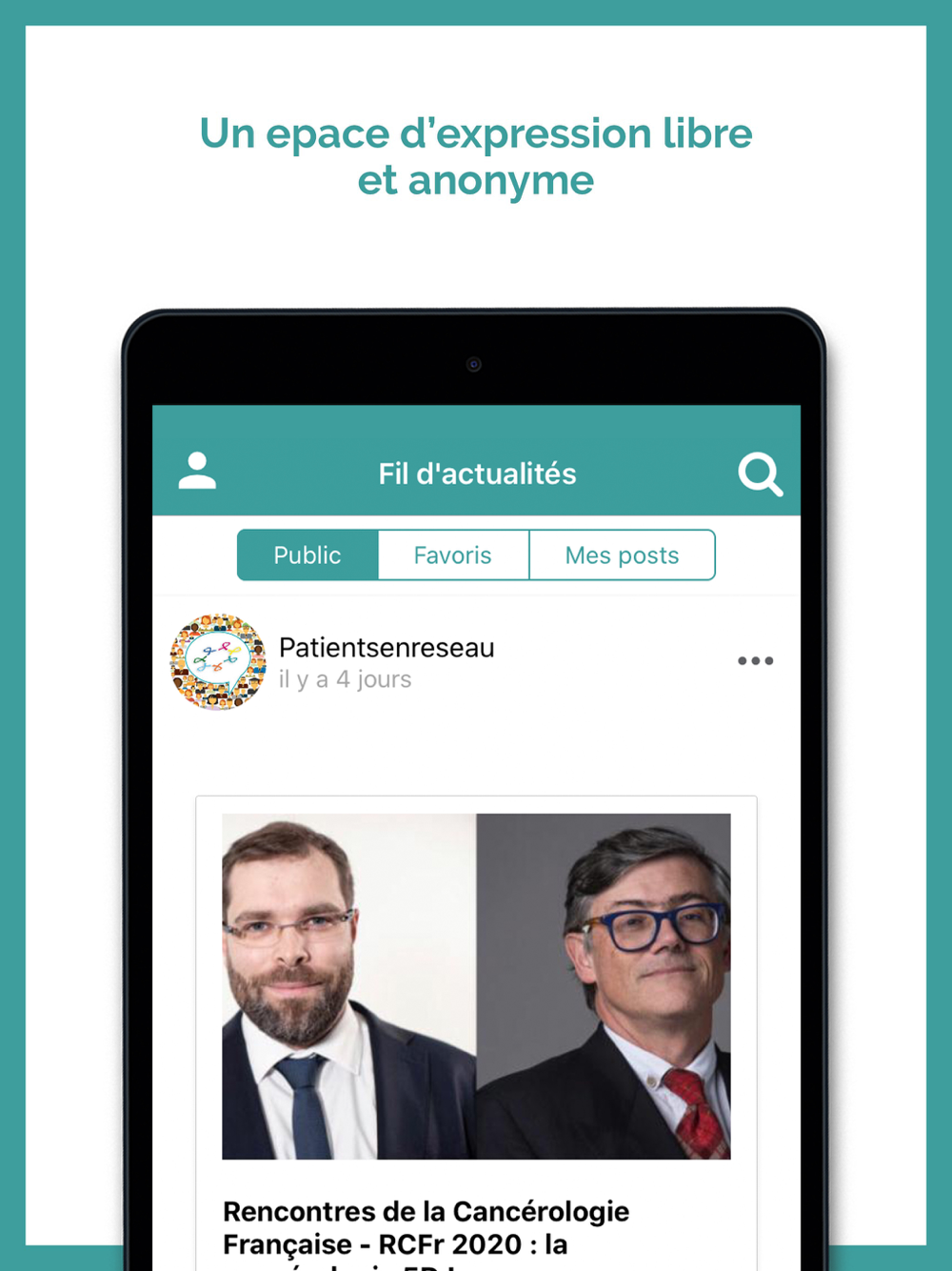 Réseau social sécurisé, anonymisé, modéré et gratuit qui favorise le partage et le soutien entre malades ou proches quelque soit le moment ou le lieu de vie, facilite l’accès aux professionnels et associations de proximité et le recours à une information utile et fiable.