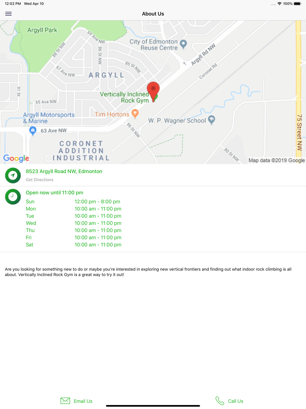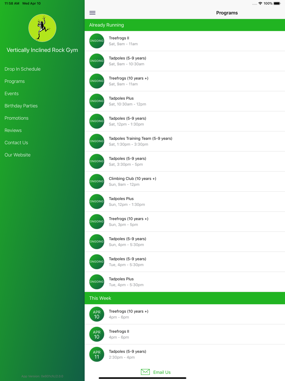 The Vertically Inclined Rock Gym app allows you to discover the current schedule of programs, special promotions being offered and connect with Vertically Inclined through email, phone and social media.