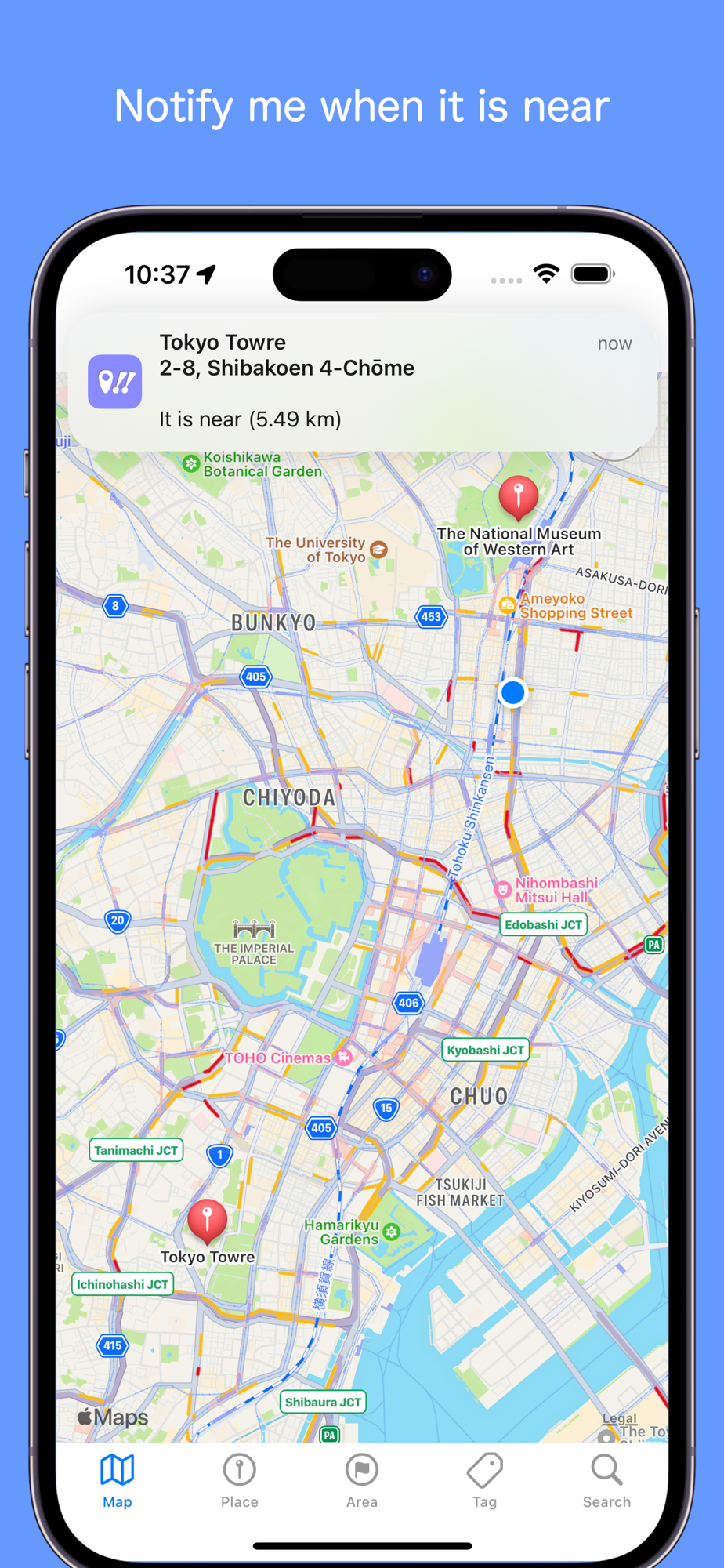 - Notice by notification when approaching the registered place (Geofencing function)