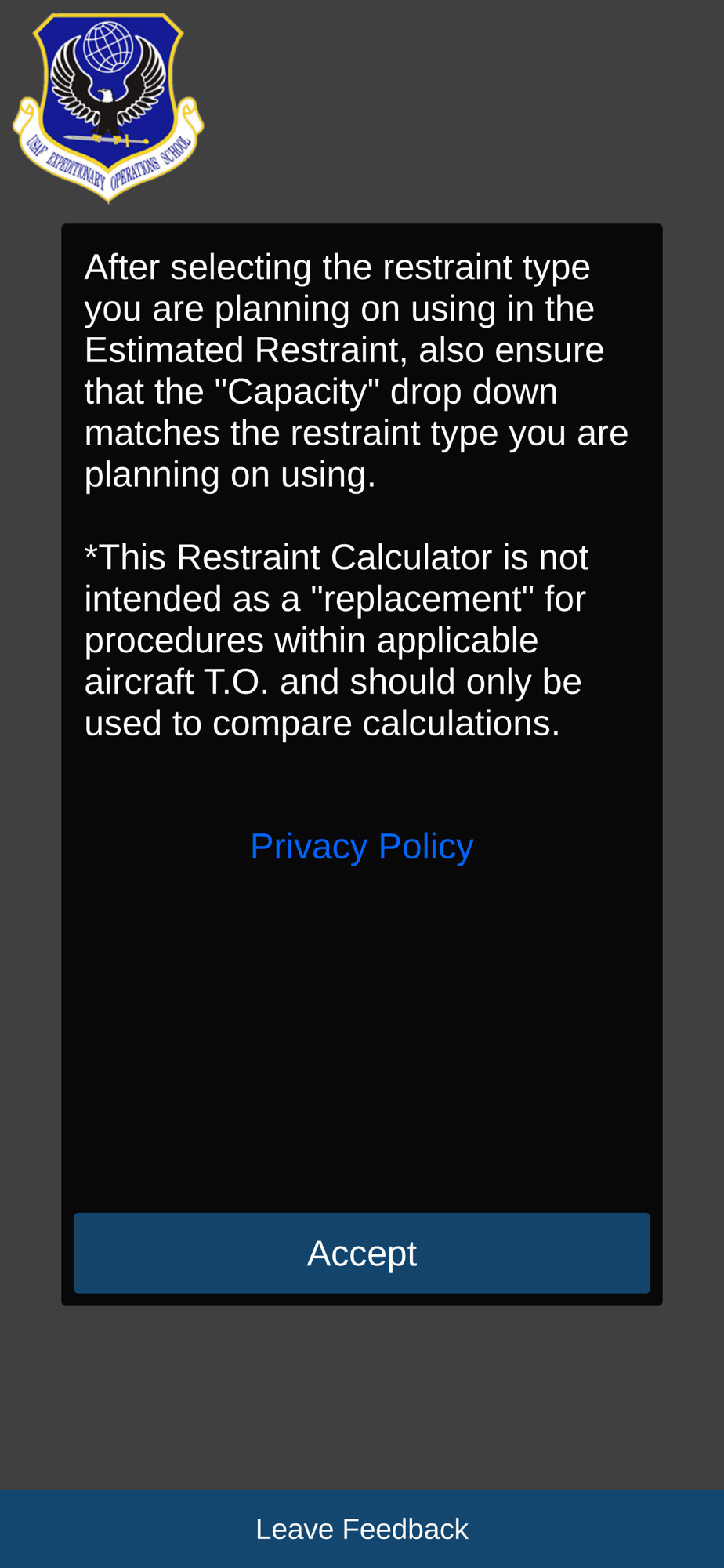 The Restraint Calculator is a tool designed for planning and checking restraint for a given piece of cargo flying on AMC aircraft. It is broken down in 3 sections: “Total Restraint” displays the amount of restraint required vs the amount of restraint provided, “Estimated Restraint” allows you to estimate/plan for how many devices are needed for the given piece of cargo, and "Current Restraint" allows you to calculate the actual restraint each piece of tie-down is providing for any given direction. This Restraint calculator is not intended to replace applicable technical orders, all calculations should be checked for compliance with aircraft limitations.