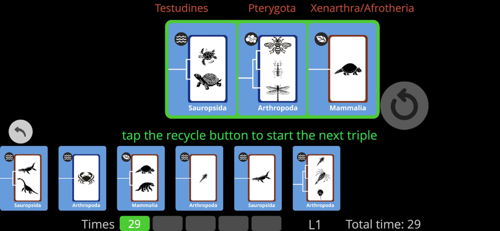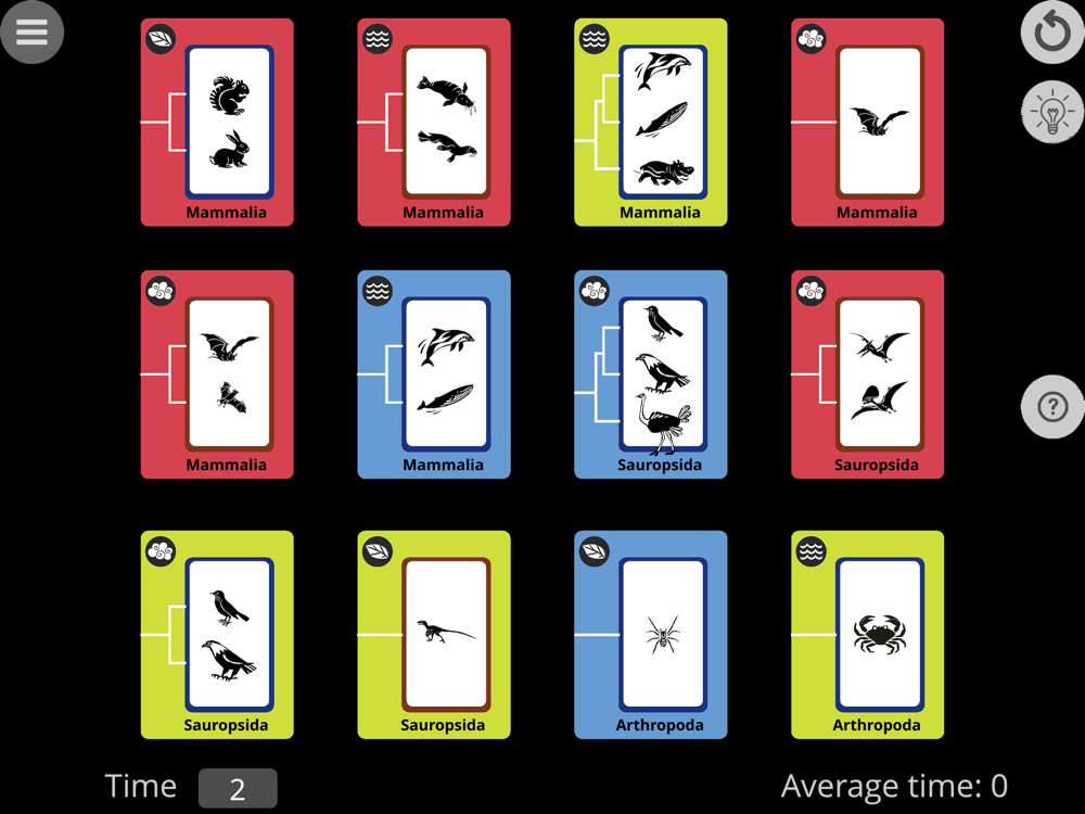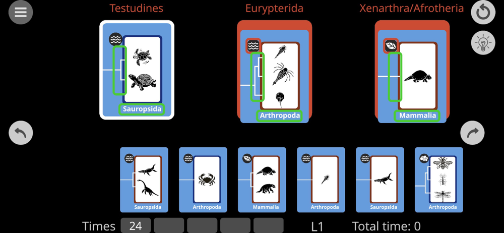 Clades Solo challenges you to match animal cards according to their evolutionary relationships. A “clade” is a complete branch of the evolutionary tree, such as mammals, arthropods, and sauropsids (reptiles and birds together). Can you make a triple match with one card of each clade? What about animals of the water, land, and air? How fast can you spot the two cards that go with the first card to make a “triple”?