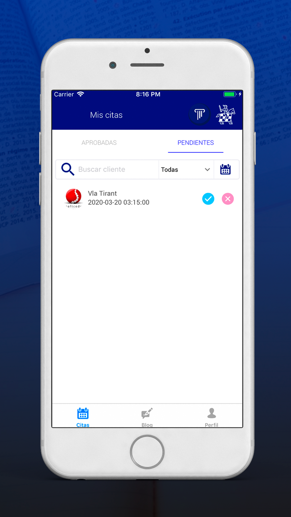 VLA TIRANT. Herramienta de comunicación entre abogado y cliente. Se reservarán citas en horarios pactados y a la hora de la misma se entrará en una sala de videoconferencia donde se realizará la asesoría legal necesaria. AL FINAL DE LA CONVERSACIÓN SE GENERA UN REPORTE DE TIEMPO Y UN CARGO.