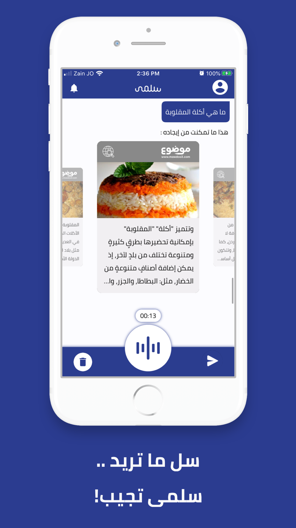 تساعدك سلمى على الحصول على إجابات ﻷسئلة عديدة مثل: ما هي عاصمة ماليزيا، ما هي مضار استخدام الهاتف النقال على اﻷطفال، كيفية علاج اﻻمساك، كيفية تحضير الكبسة... وتخبرك أيضا عن التوقيت الحالي والحالة الجوية في أي مدينة حول العالم، بالإضافة لأوقات الصلاة وتحويل العملات والعديد من الخصائص الأخرى للمحادثة.