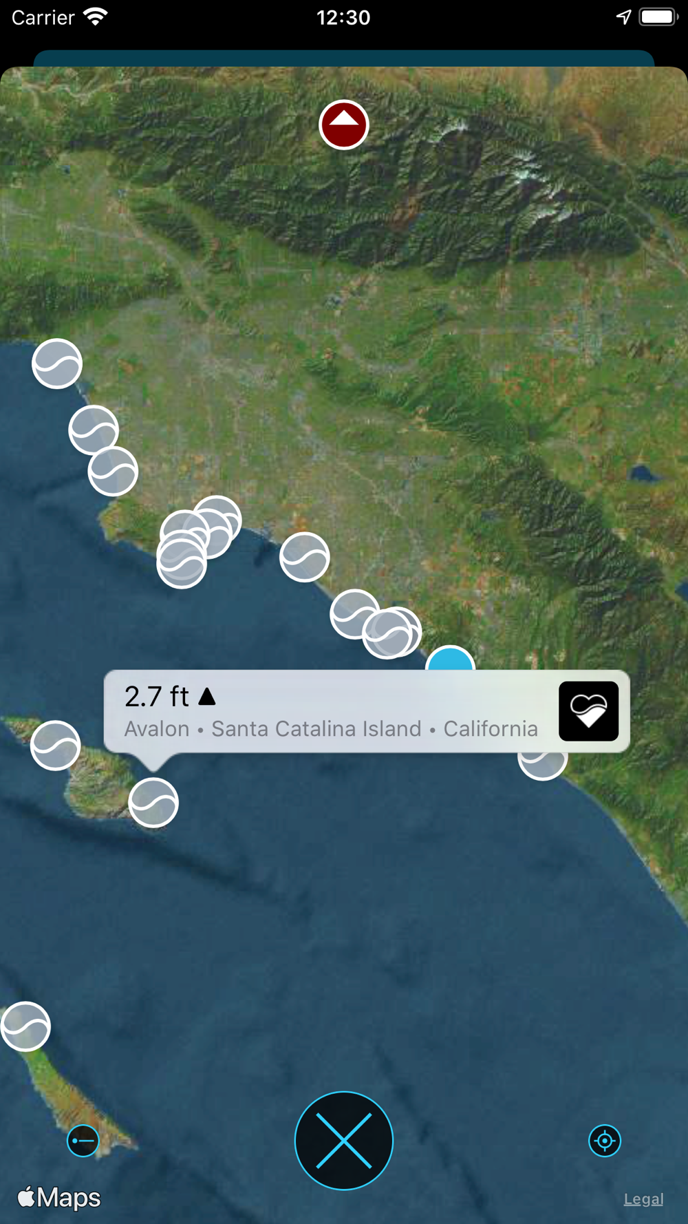 This view of the sea shows markers for observations collected by the National Data Buoy Center. The arrow points in the directions waves are heading: tap it to show water temperature, wave height, and an average period between waves. To make any buoy's data show up on the home screen, tap the heart icon.