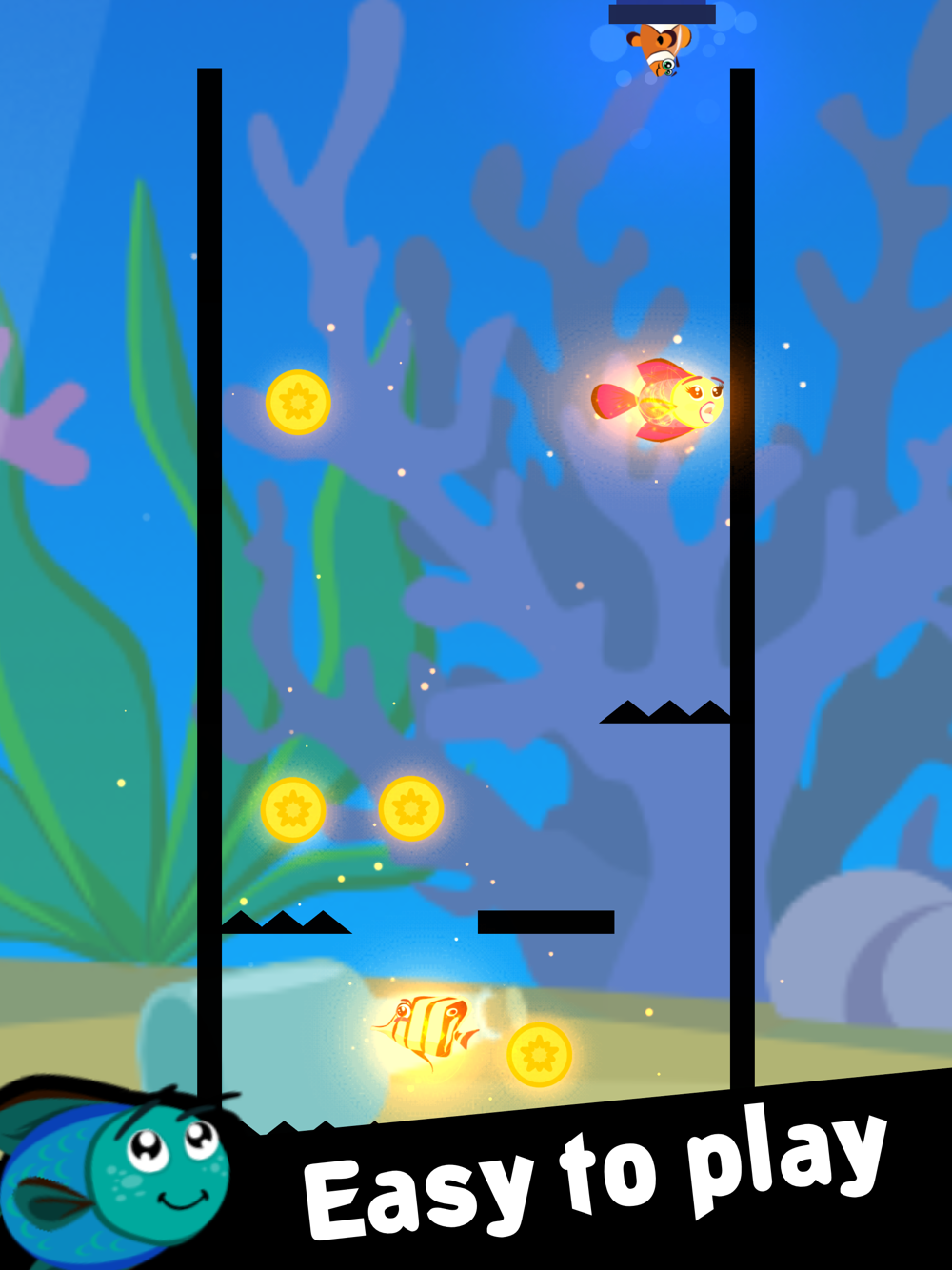 Puzzle mode: is about completing the hand designed levels by dropping the fish to collect all the coins in each level. The challenging levels are all about dropping the fish in the right order while avoiding the spikes. There are bounce pads to use and doors to unlock. Also, fish can swim into whirlpools to teleport across to another part of the board. You will enjoy the peaceful game play and beautifully designed levels.