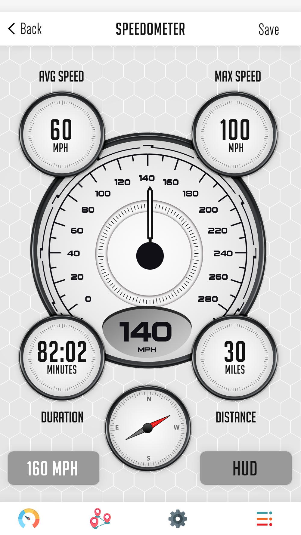 可以使用GPS里程表主屏幕上的简单按钮激活抬头显示器。抬头显示器是通过创建GPS车速表屏幕的镜像来创建的.GPS里程表应用程序通过结合基于GPS的读数和未来派的抬头显示器(也称为HUD)将传统的车速表和里程表提升到了一个新的水平。