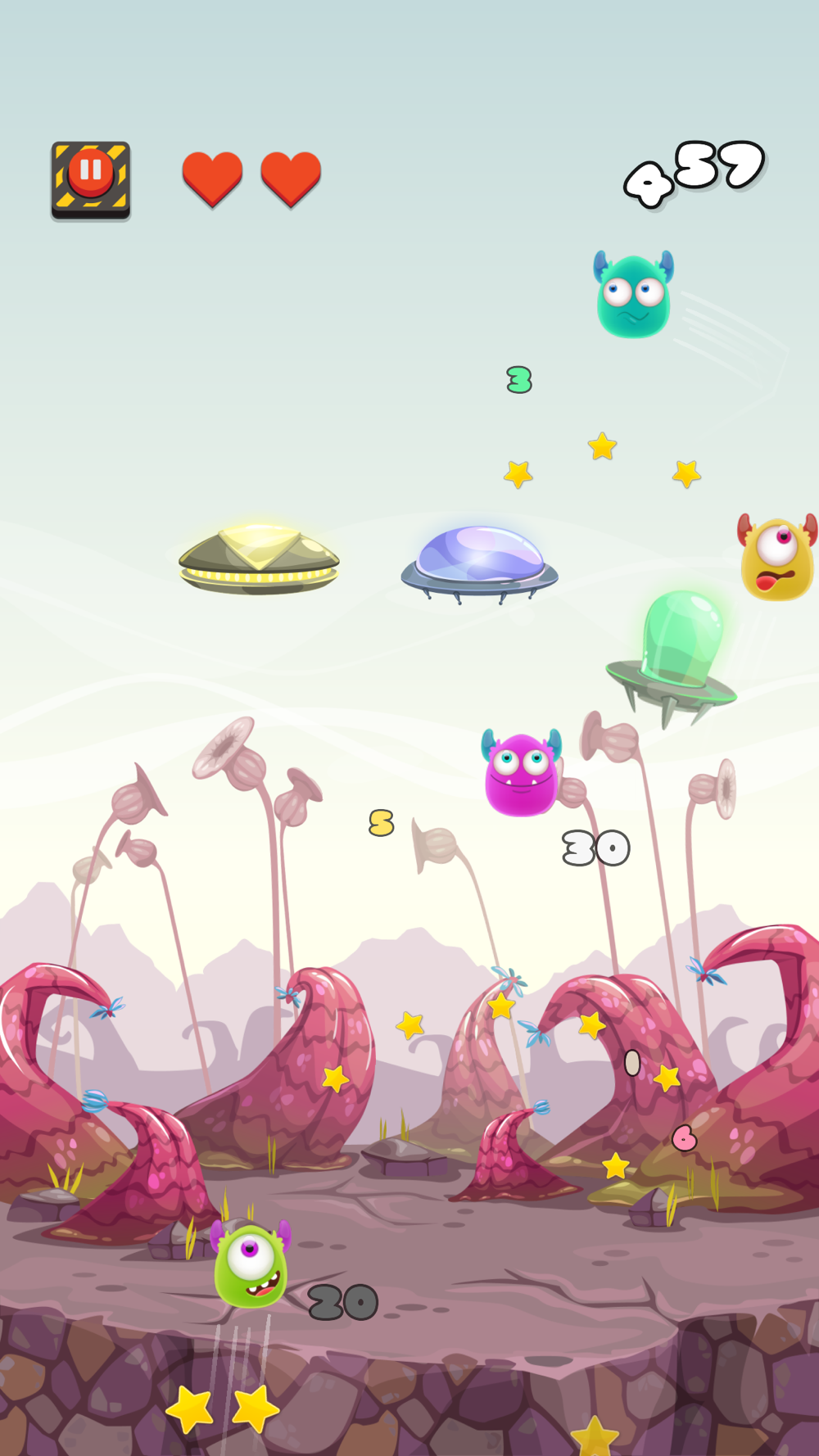 The mission of this game is very simple but challenging: player needs to help delightful and cute little aliens to jump, hop and bounce in order to stay alive and not to fall out of the screen.
