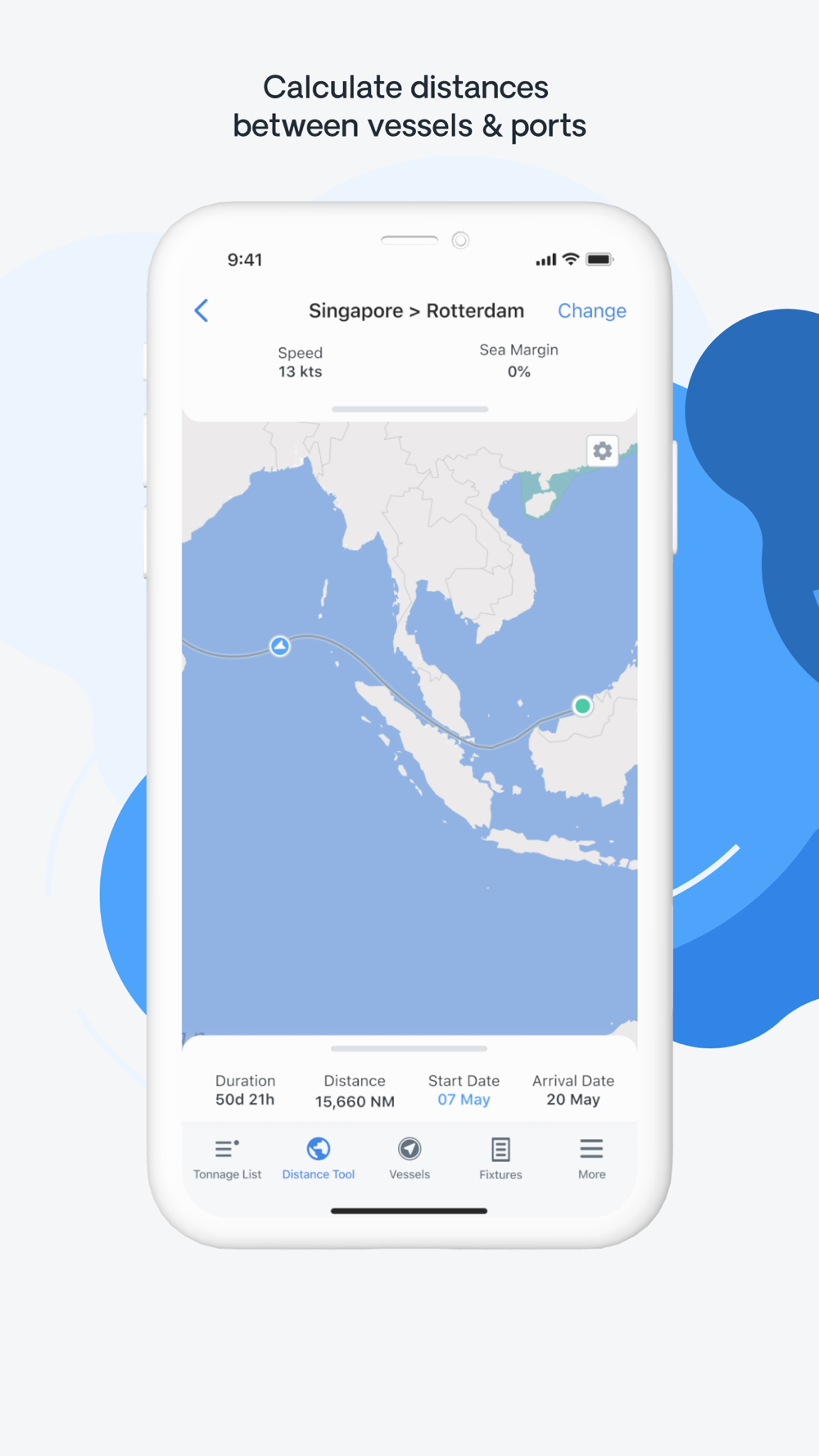 • Distance Tool: Know when a vessel is expected to arrive at a specific port and calculate timings on the go.